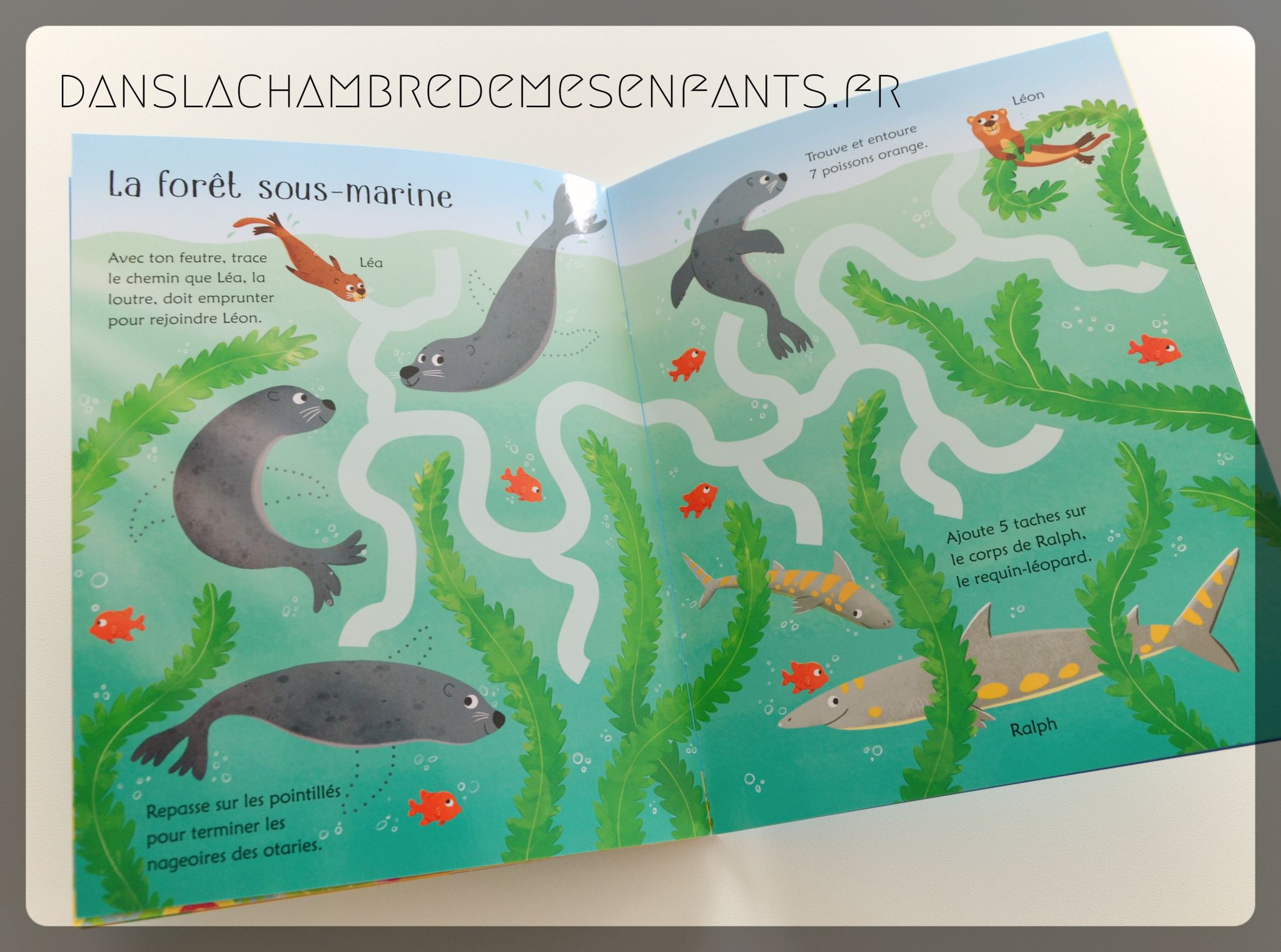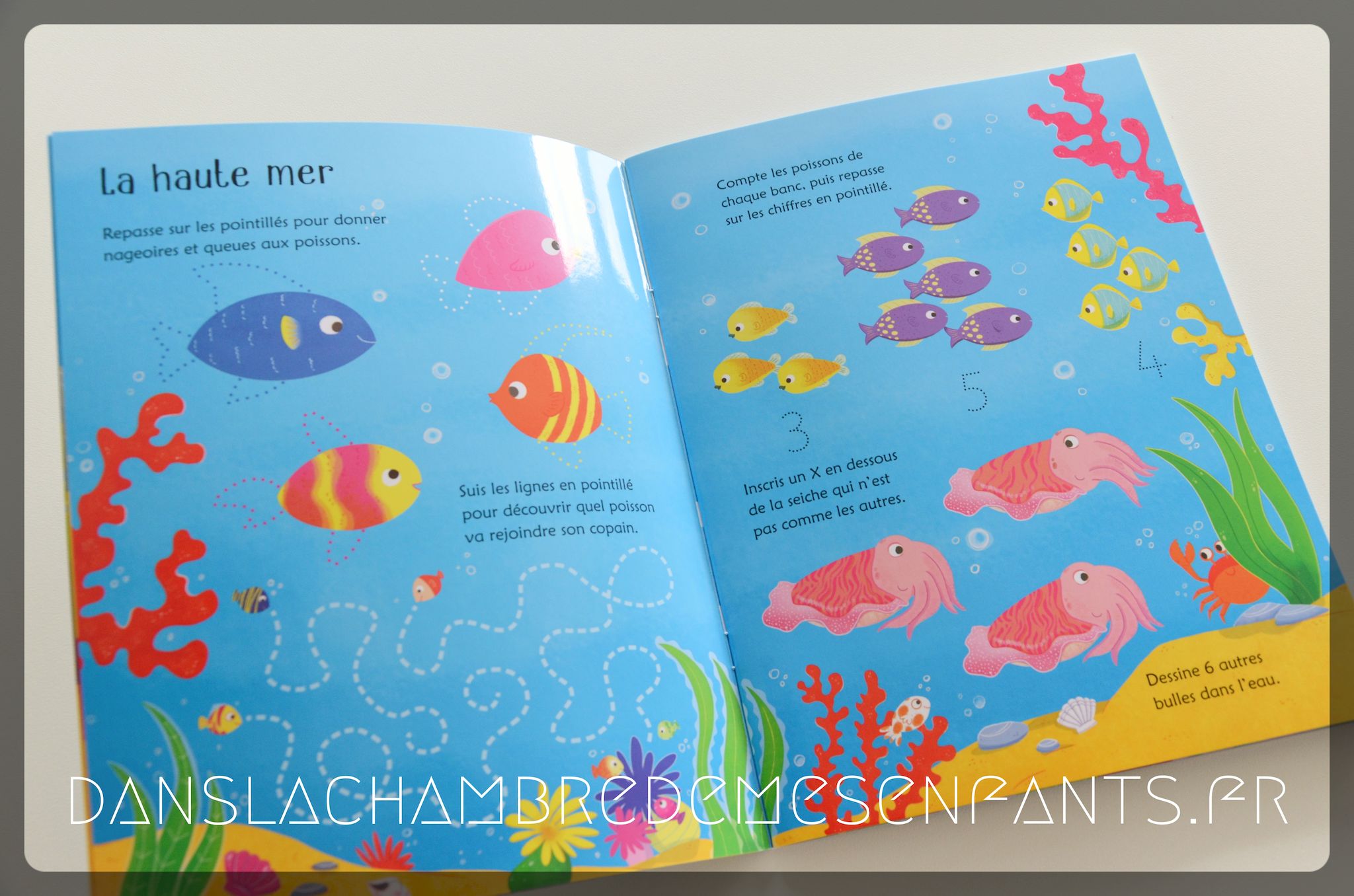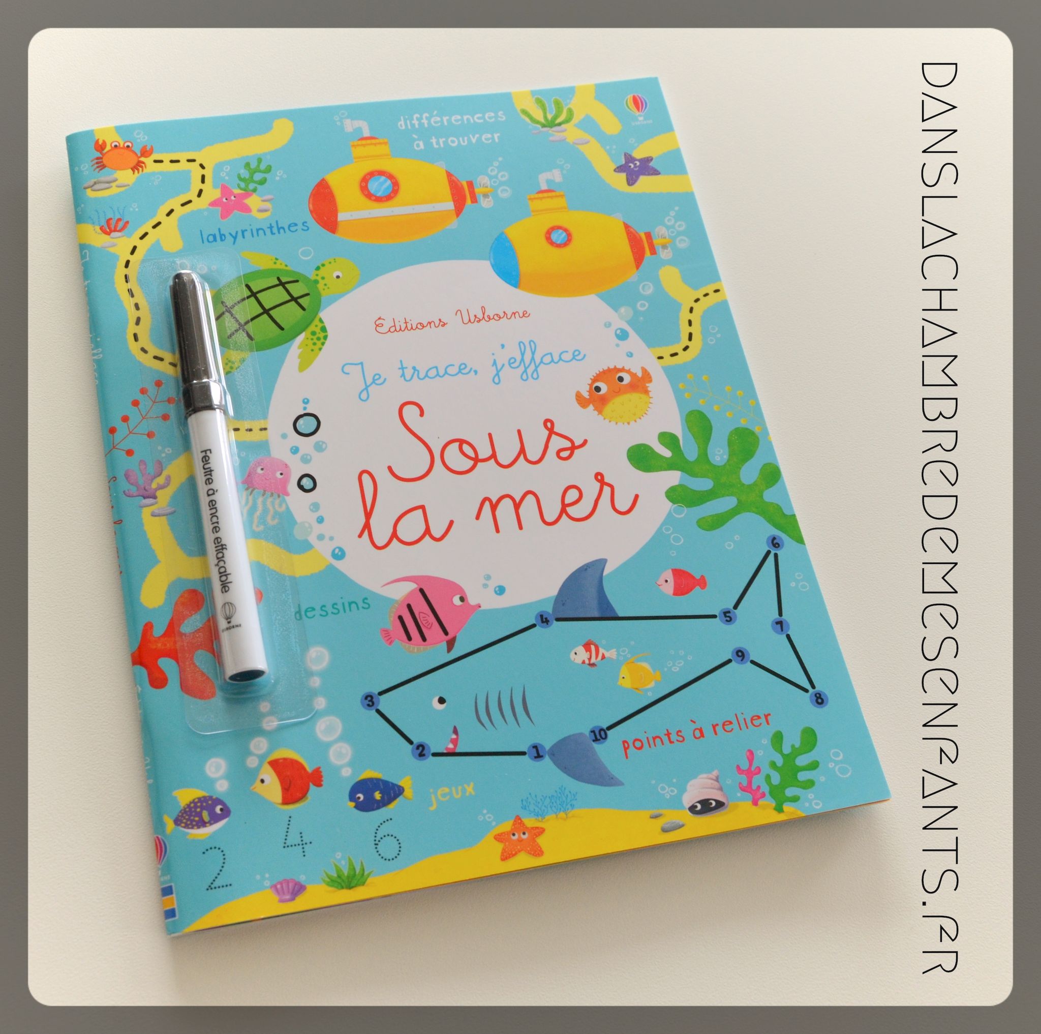 Avec ses pages plastifiées et son feutre effaçable, le format permet de s’amuser et d’améliorer la dextérité en recommençant. Des points à relier, des chiffres à repasser (jusqu’à 10), des dessins à faire selon des pointillés, des objets à entourer, etc… autant de petits jeux à découvrir selon divers tableaux très colorés (fonds marins, haute mer, récif de corail…).