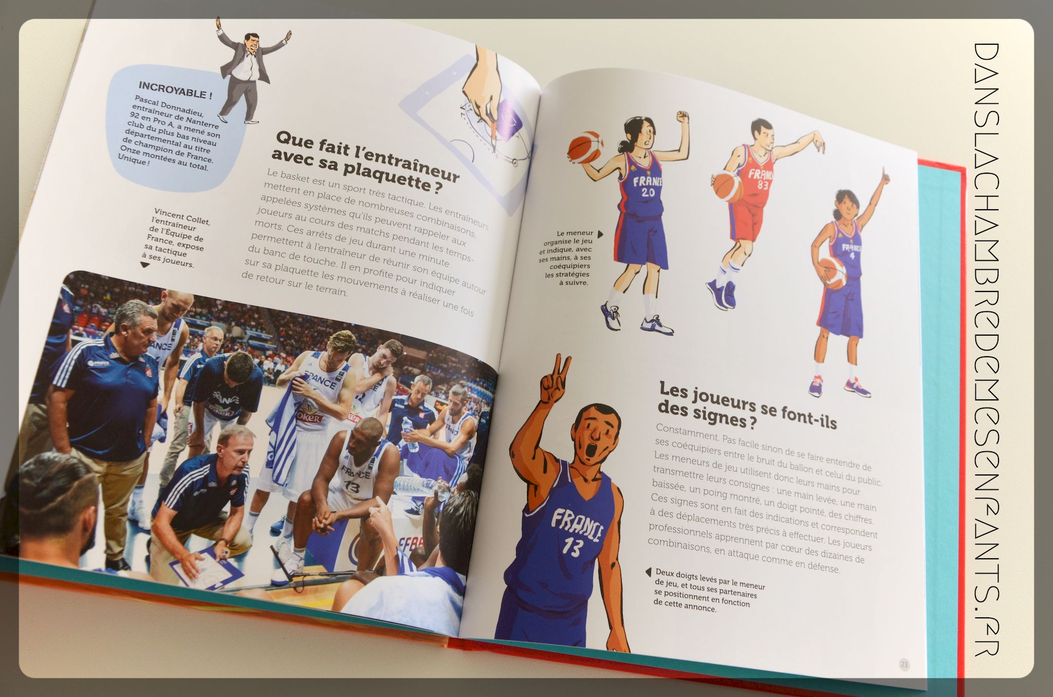 Encore un petit nouveau dans cette collection, dès 7 ans. On retrouve le principe d’information à travers divers questionnements mais de façon plus développée, avec des illustrations de différentes natures (photo, dessin). Ici, pas de jeu en coin de page mais une lecture tout aussi dynamique avec des informations étonnantes (ex : « Afin d’améliorer leur technique les équipes de jeunes ont souvent recours à des lunettes de dribble. Leur particularité ? Elles empêchent le joueur de voir ses mains. Imparable pour garder la tête levée et voir parfaitement le jeu. »). Le sujet est encore bien traité et on termine la lecture avec un bon (premier) tour d’horizon : origines du sport, méthodes de jeu et rôles, les joueurs stars…