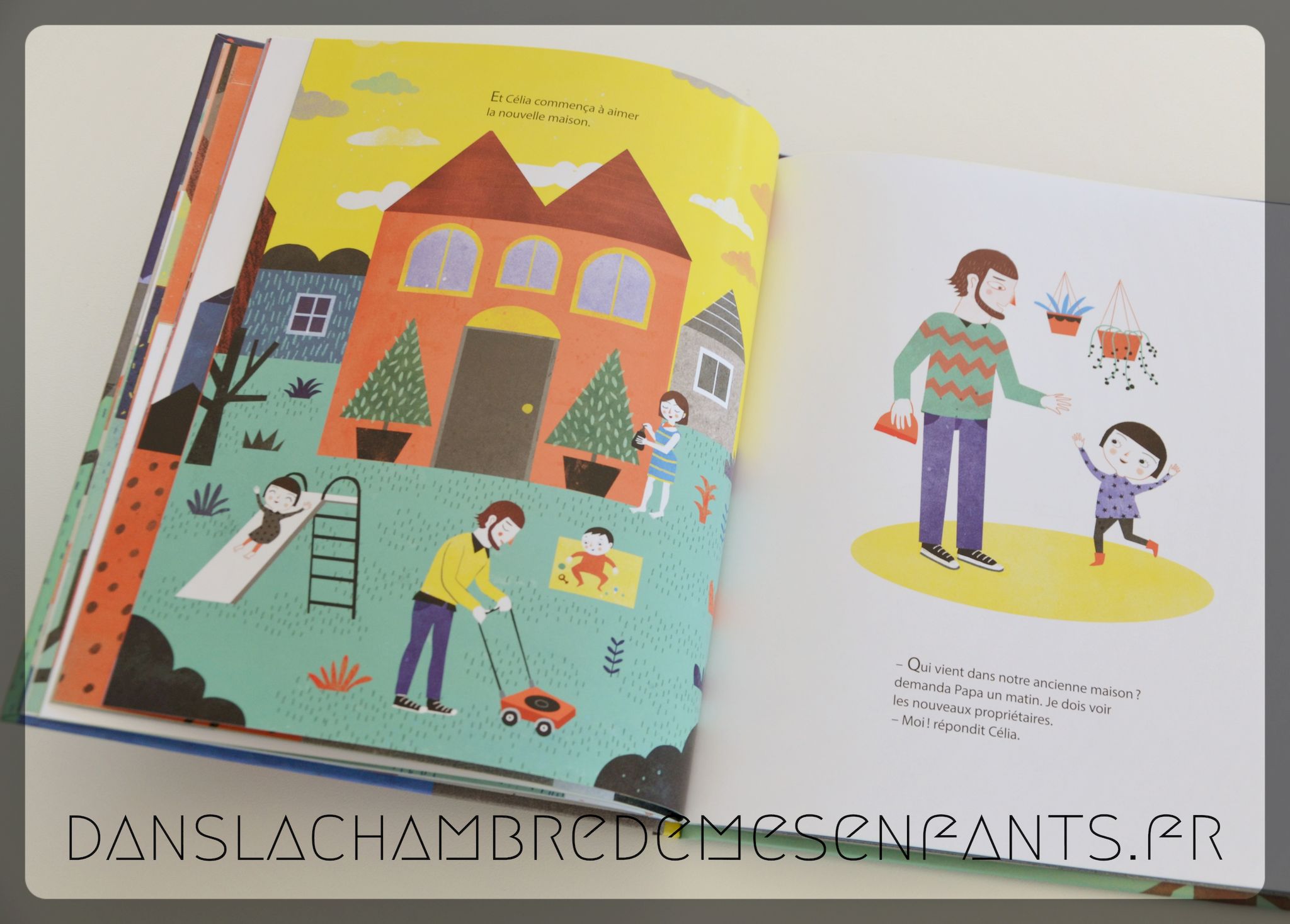 Célia adore sa maison qui est pour elle comme une amie protectrice, à tel point qu’elle lui parle et lui apprend un jour que sa famille va déménager. Des boîtes, des cartons, un grand camion… elle suit les étapes et apprend à aimer sa nouvelle maison, trouvant une place à chacune de ses affaires. Elle n’a pas oublié pour autant son ancien nid douillet et le découvre bien changé.