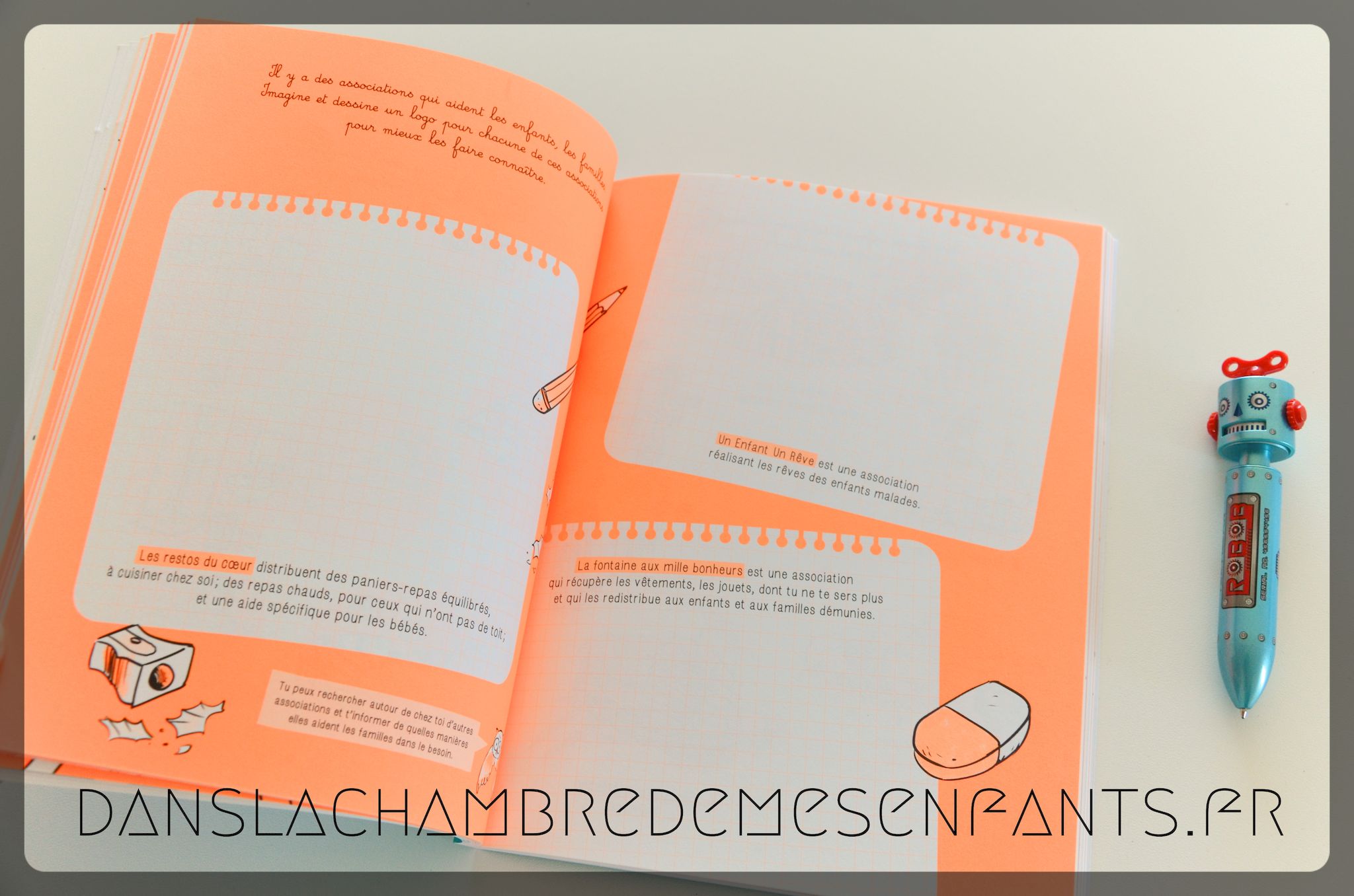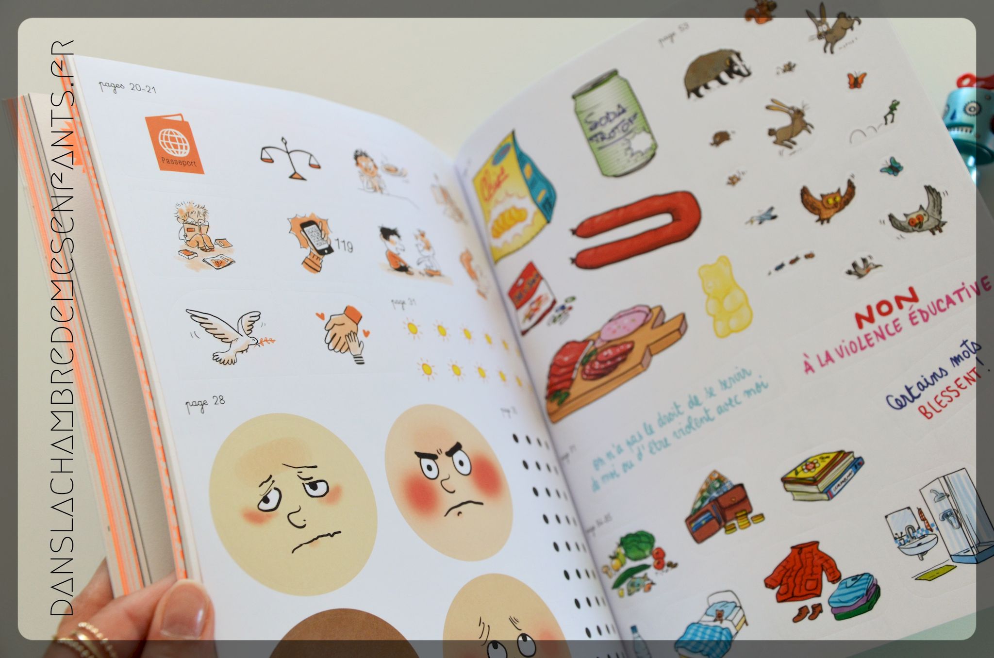 Des jeux d’expression ou guidés (ex : relier des situations à des « demandes » de respect), du dessin ou des ateliers sont proposés pour faire connaître le droit des enfants (Convention des droits de l’enfant : le droit d’avoir une identité, le droit de s’exprimer, le droit à l’égalité…) notamment à travers des situations du quotidien, ainsi que le guide pour les parents en fin d’ouvrage.