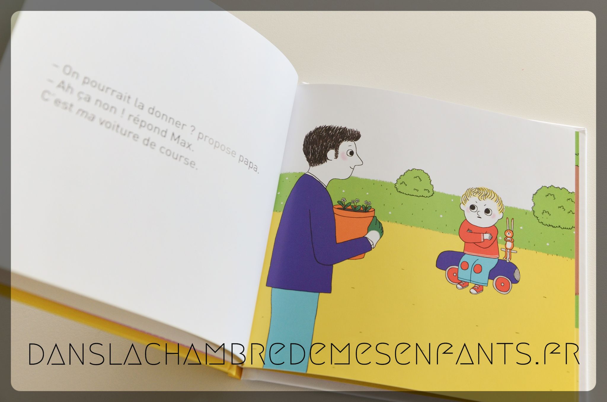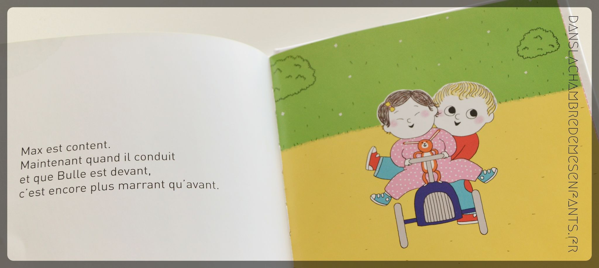 Avec la venue de sa petite sœur, Max découvre les choses à une autre échelle. Cette fois-ci, il refuse de donner sa voiture de course, devenue trop petite mais elle n’est pas vraiment perdue si Bulle en hérite. Le partage a du bon, surtout si cela permet de nouveaux jeux !