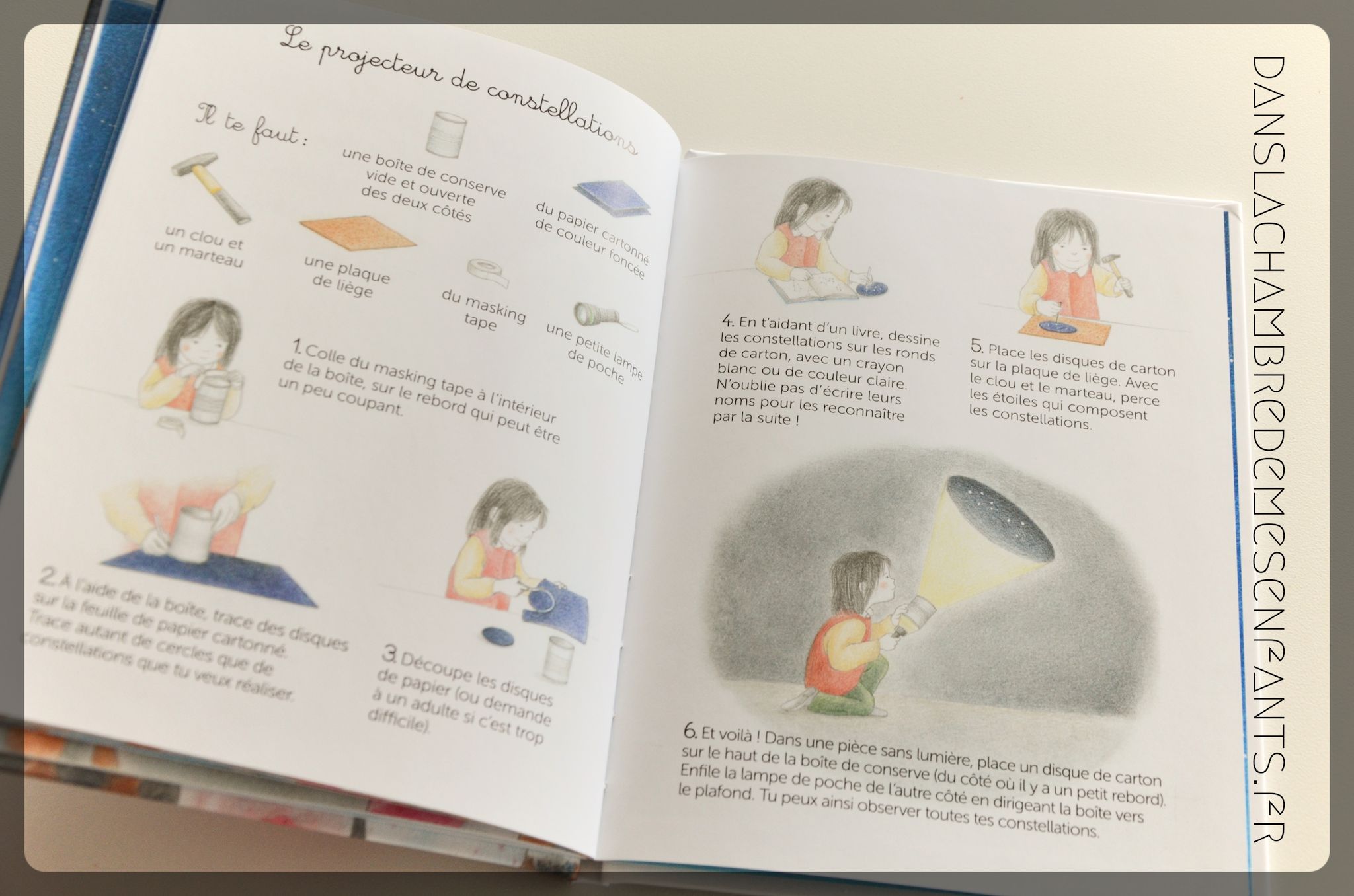 L’histoire est très brève pour amorcer le sujet et l’atelier est une bonne idée mais à réaliser avec un adulte (contrairement aux dessins y figurant et aux indications s’adressant directement à l’enfant) pour manipuler un clou, un marteau et disposer d’une boîte de conserve ouverte des 2 côtés (!).