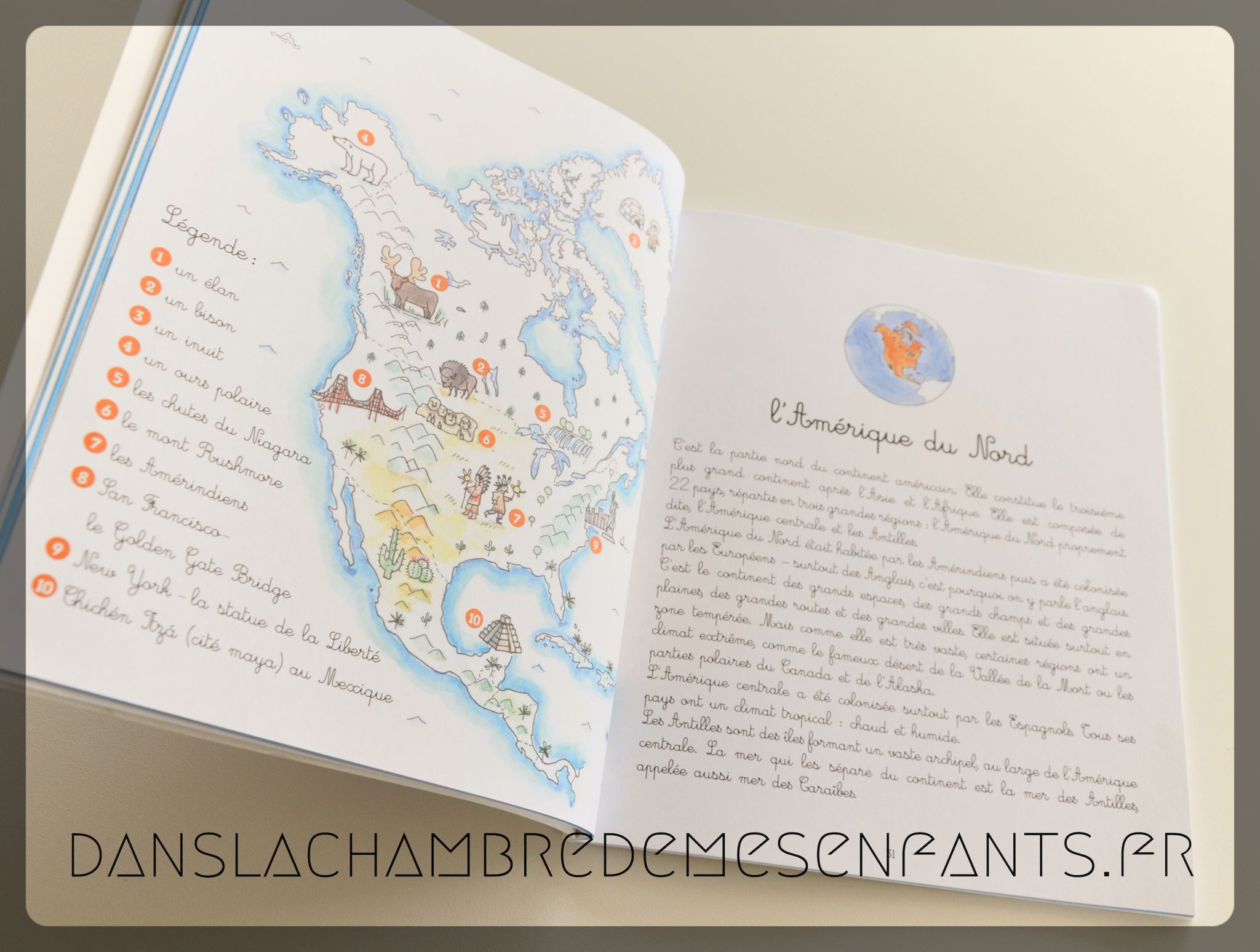 Après un commentaire destiné aux parents, une introduction est faite en atelier à réaliser pour comprendre la forme de la terre (découpage d’une peau d’orange pour comparaison). Le livre se poursuit avec la présentation des continents, accompagnée d’une illustration portant quelques références (ex : le vieux continent avec 44 pays, son climat… le fjord en Norvège, la Tour Eiffel…), puis d’une carte à compléter avec les stickers par le nom des pays, une autre à compléter par le nom des capitales, enfin par leurs drapeaux. Une grande carte du monde à afficher est fournie, permettant à l’enfant de s’y reporter pour apposer les légendes (nom des pays, capitale, drapeaux).