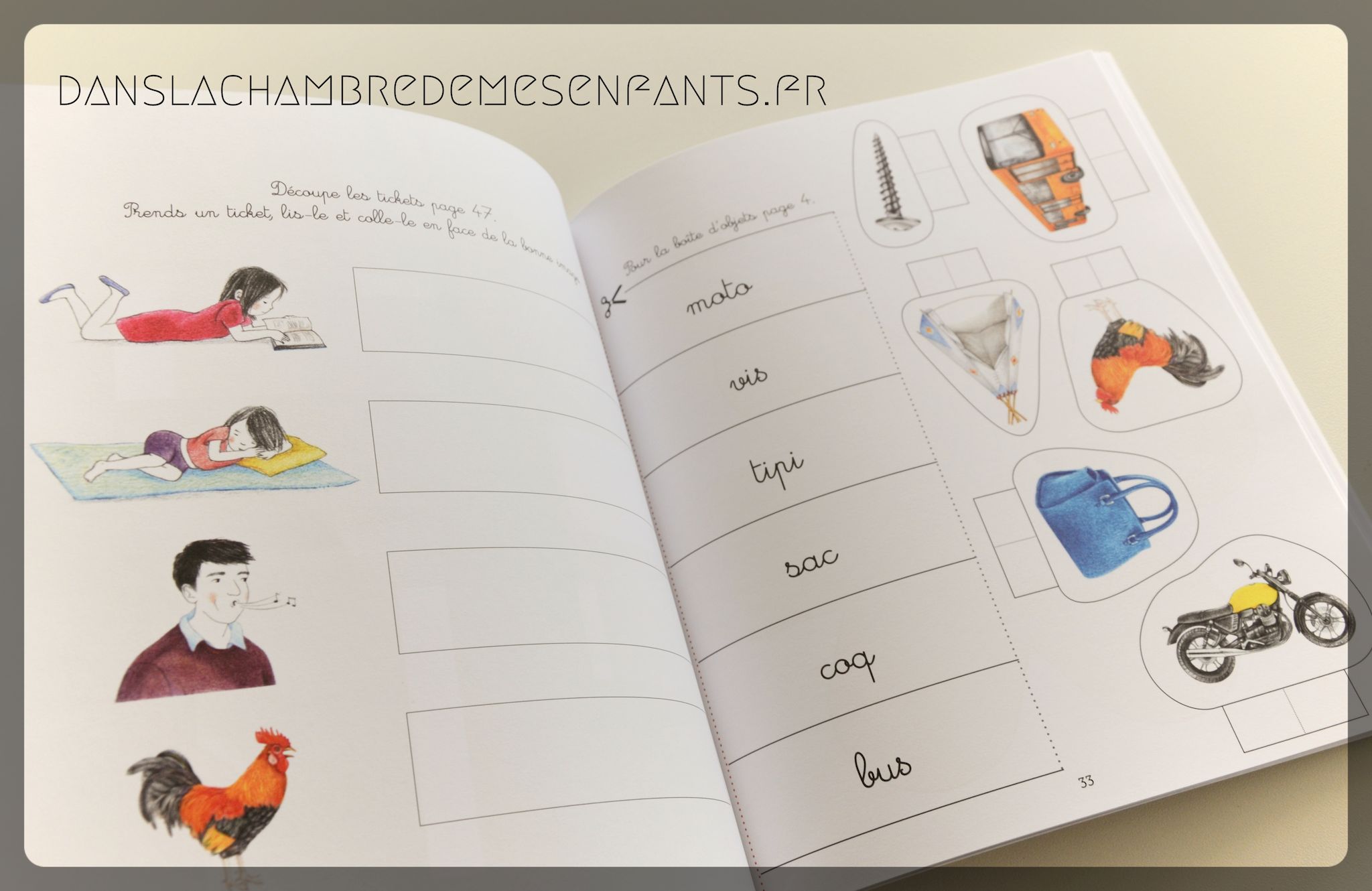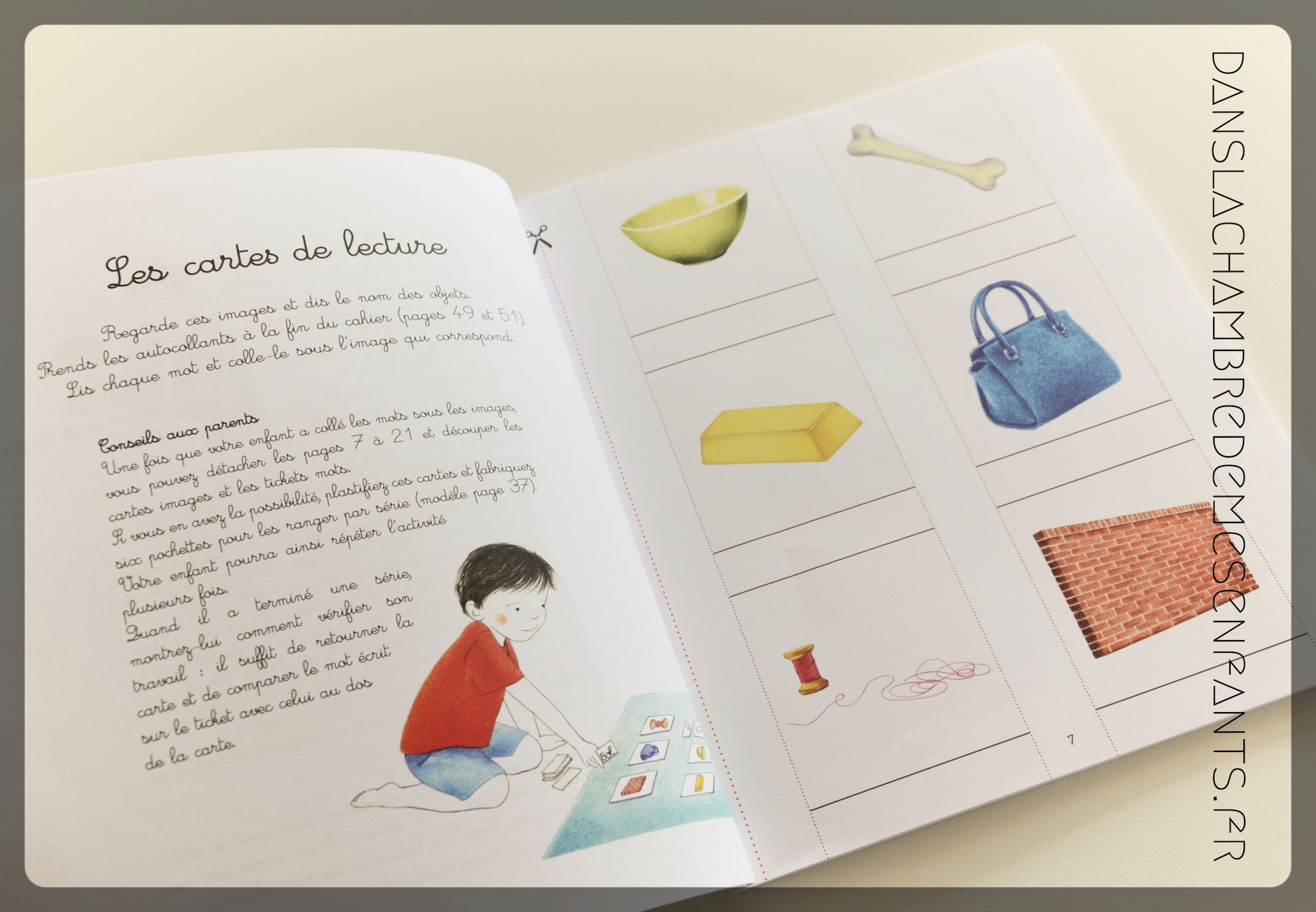Il comprend des cartes d’images et de mots à découper, ainsi que 3 planches d’autocollants, pour divers jeux d’association image/mot : associer des cartes avec une mise en scène (message secret : « donner l’image de ce qui est écrit » : moto, tipi, sac…), coller le nom des objets sous les images (bol, os, mur…), relier les mots et les images, coller le nom directement sur les objets de la maison, dessiner ce qui est écrit, faire à tour de rôle ce qui est écrit sur le papier (tire le tapis, va à la porte, crie fort…), etc.