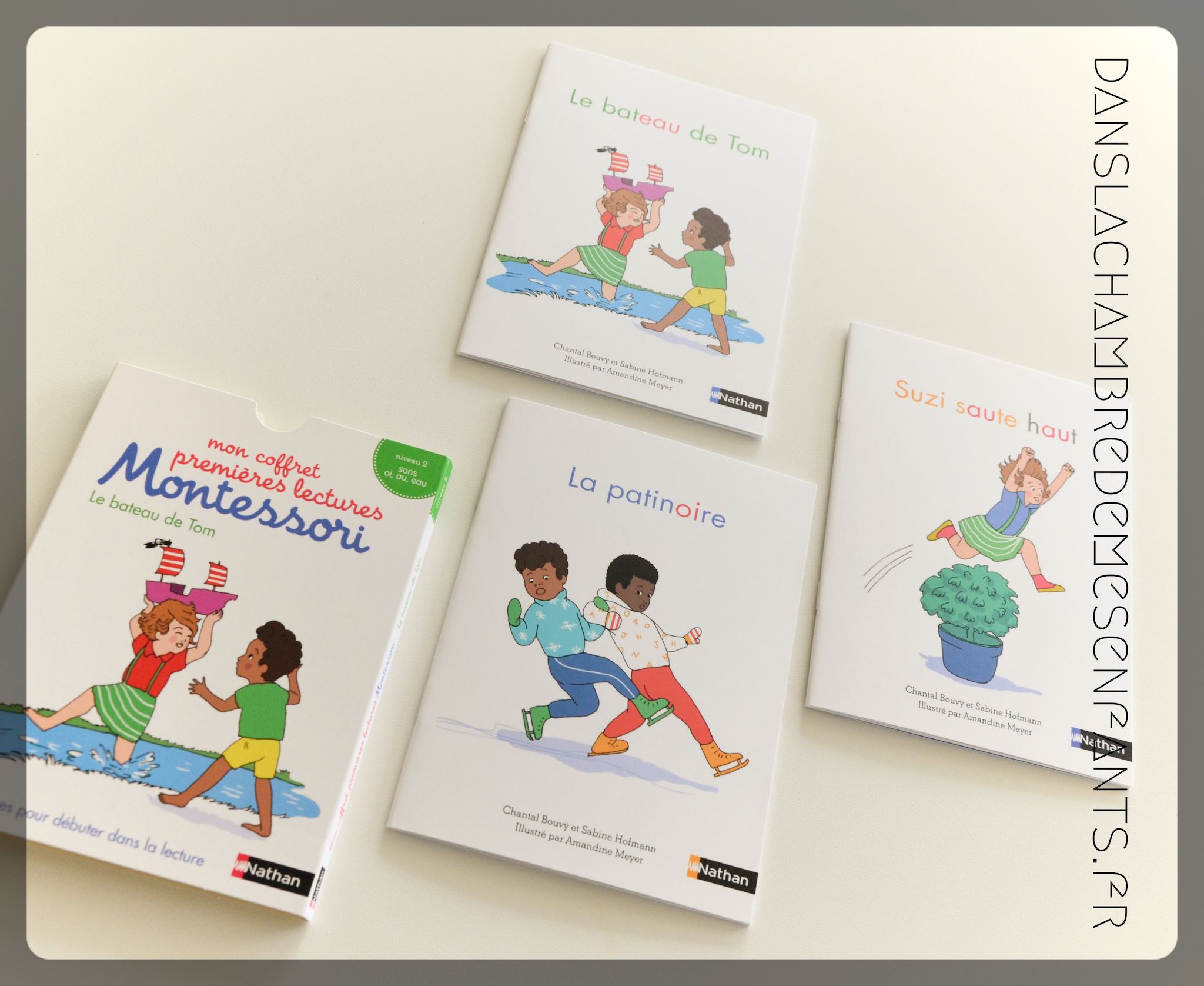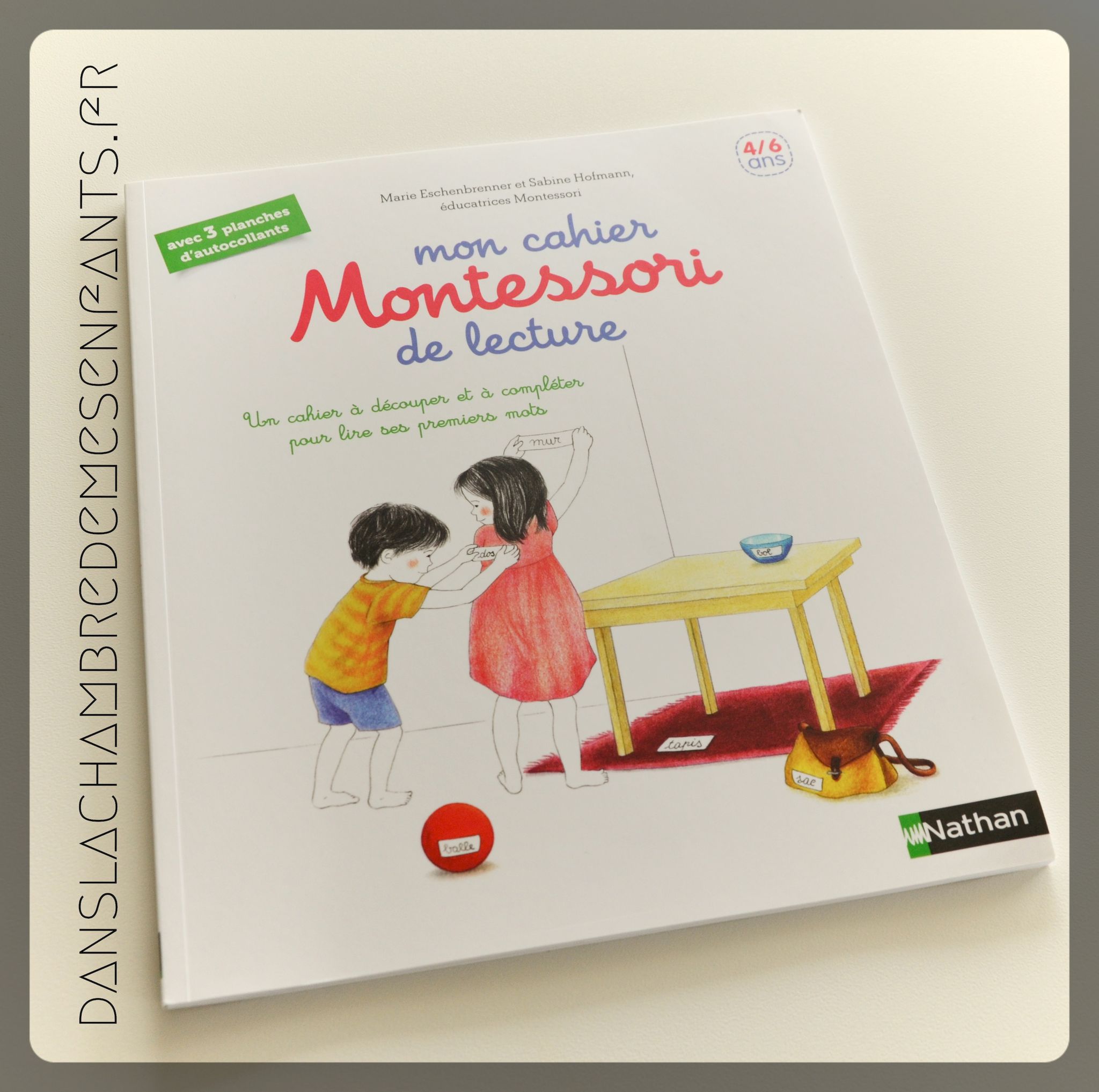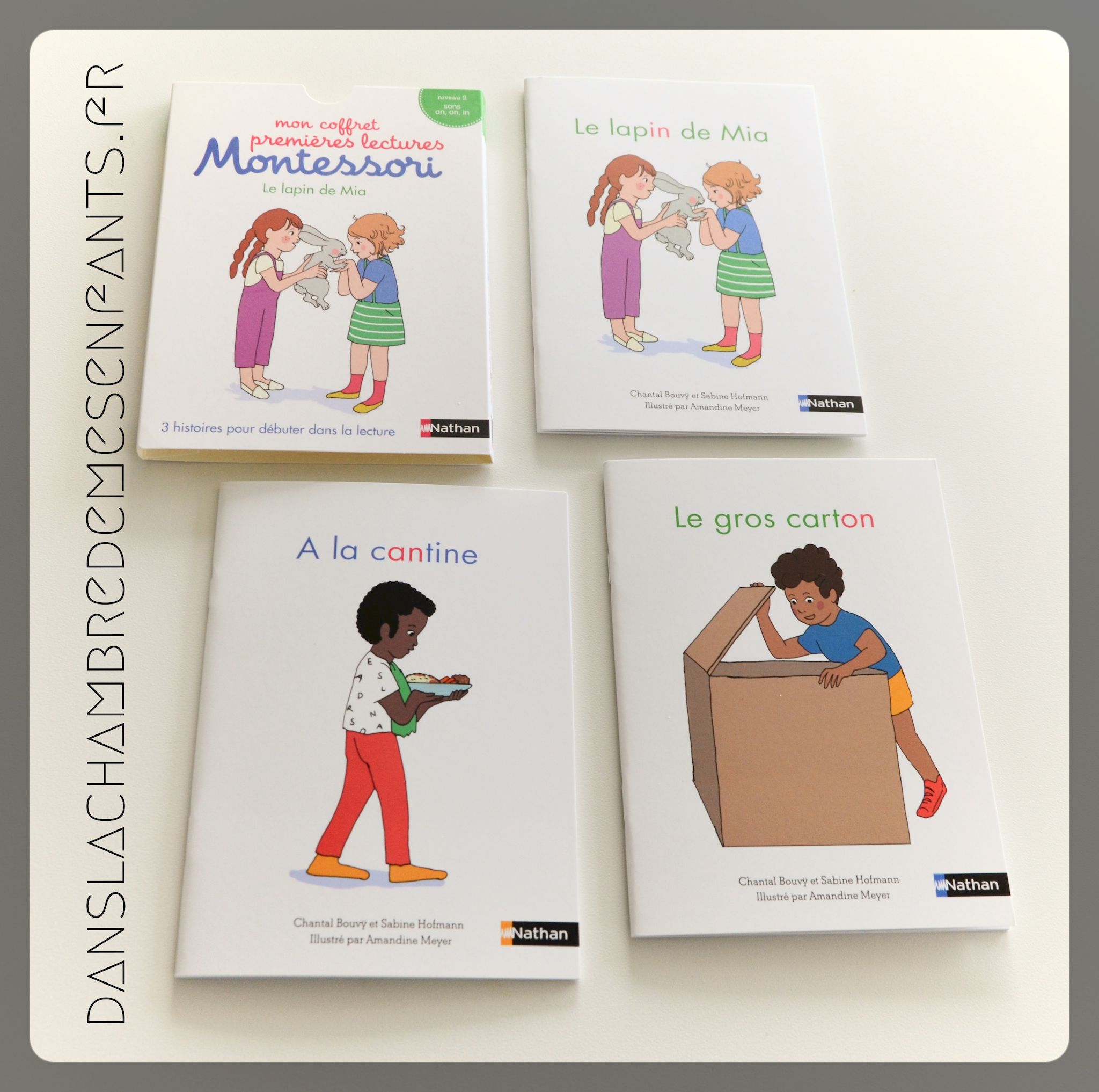 "Mon cahier Montessori de lecture" - Editions Nathan - 8,40 € - 48 pages - 27 x 23 cm Auteures : Sabine Kofmann & Marie Eschenbrenner, éducatrices Montessori - Illustratrice Roberta Rocchi "Mon coffret premières lectures Montessori" - Editions Nathan - 7,90 € /ouvrage - coffret avec 3 livres de 16 pages - 18 x 13 cm Auteures : Sabine Hofmann & Chantal Bouvÿ - Illustratrice : Amandine Meyer