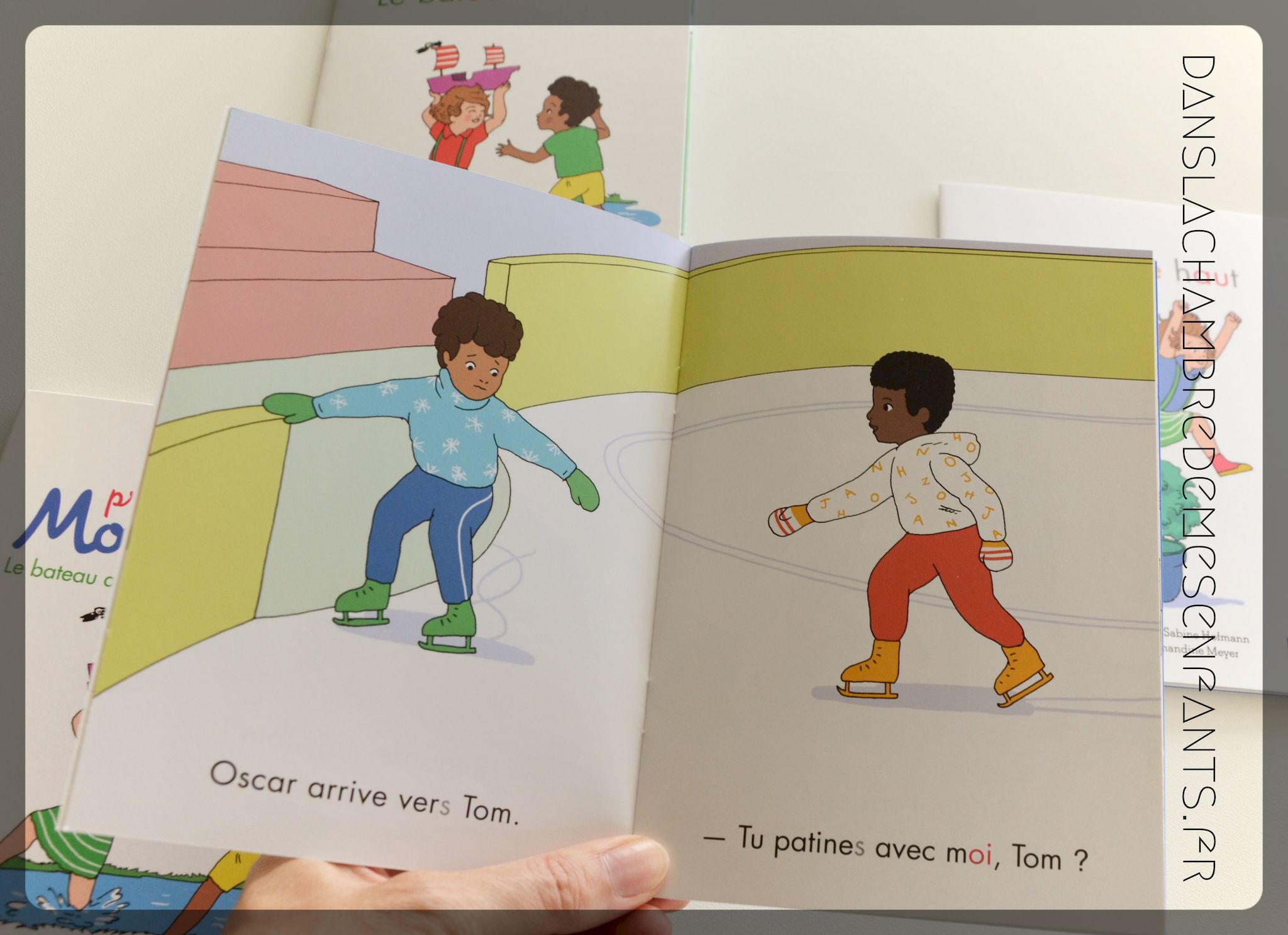 On retrouve la grande simplicité des ouvrages Montessori avec les éléments visés par l’apprentissage (ex : son « oi ») mis en évidence par le choix du vocabulaire (patinoire, soir, froid, assoit…) et une couleur différente dans le texte.