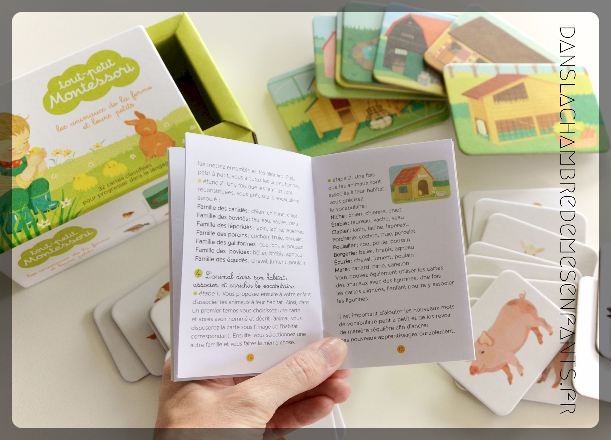 Autre thématique captant beaucoup l’attention des jeunes enfants : les animaux et leurs petits. Cette imagier sous forme de cartes (32 cartes dont 8 cartes lieux) recentre cet apprentissage sur les animaux de la ferme les plus communs (poule, lapin…) tout en présentant leur « petite famille » (ex : poule, coq, poussin) et leur lieu de vie (ex : poulailler). Le livret propose également des petits jeux évolutifs (nommer, décrire et raconter, associer et enrichir le vocabulaire avec les familles d’animaux [canidés, porcins…], associer l’animal à son habitat [clapier, étable…]).