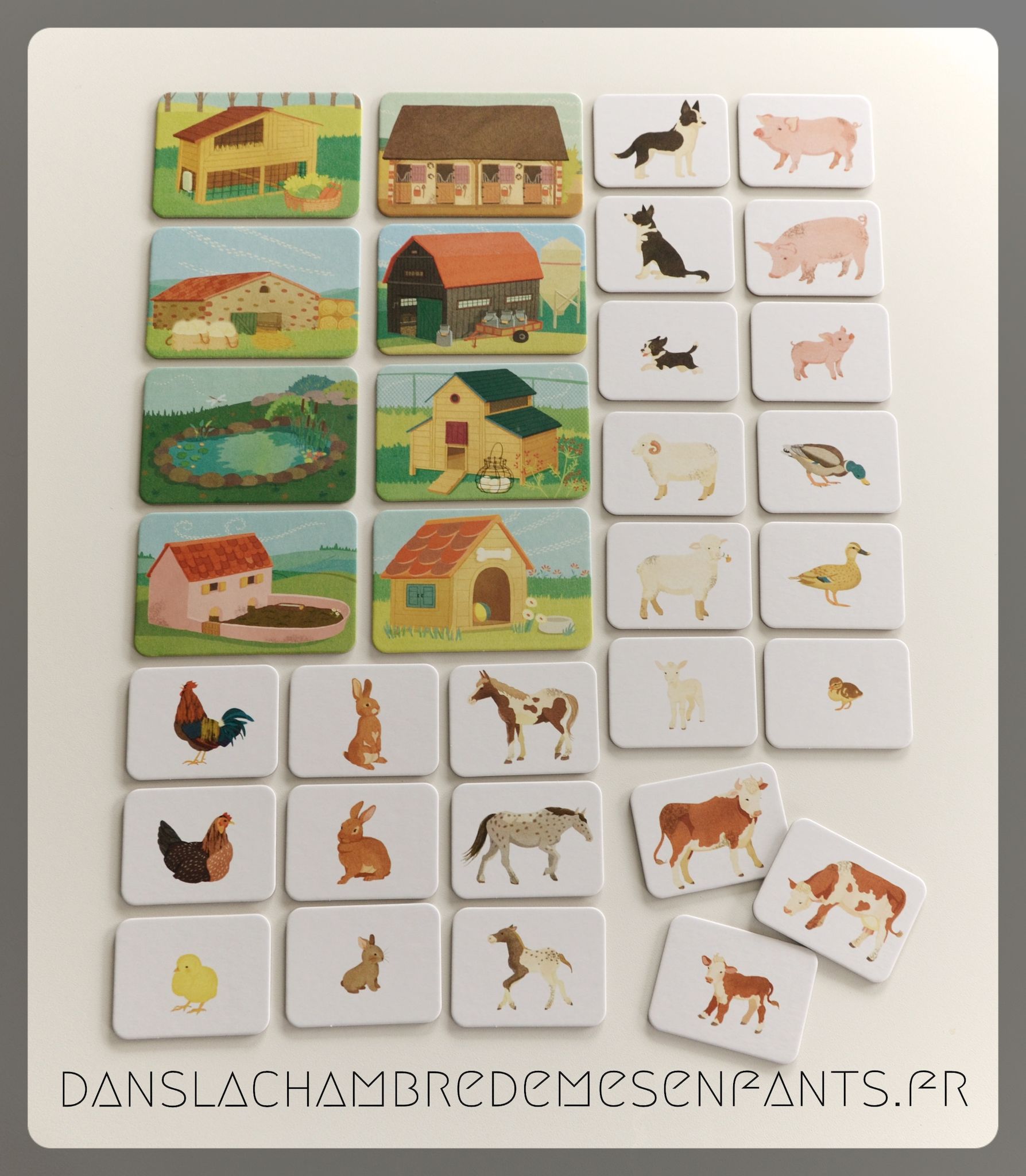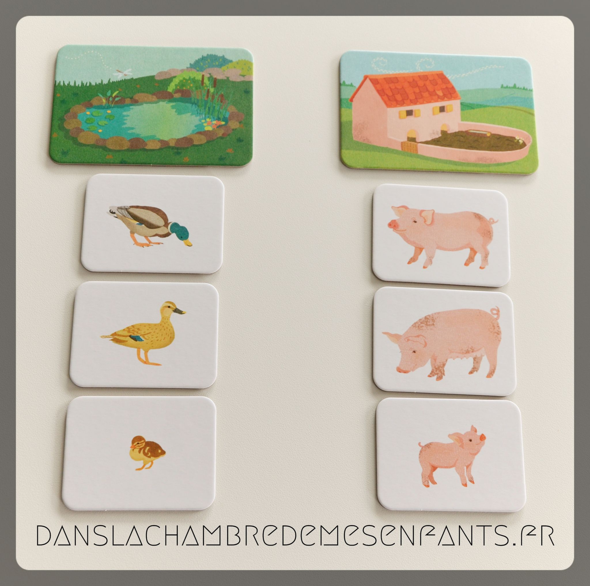 Si la quantité de figures animales est assez restreinte, je trouve intéressant que ce soit pour cibler un autre point d’apprentissage : la connaissance des familles d’animaux, notamment leurs « espèces », et souligner les différents lieux de vie, toujours avec cette dimension (sujet/lieu). C’est une variante intéressante qui s’adapte intelligemment au sujet. Si l’enfant aime particulièrement ces jeux, il peut s’avérer pertinent de poursuivre avec des images à rechercher soi-même (à dessiner ou à imprimer) et connaître d’autres animaux de la même façon.