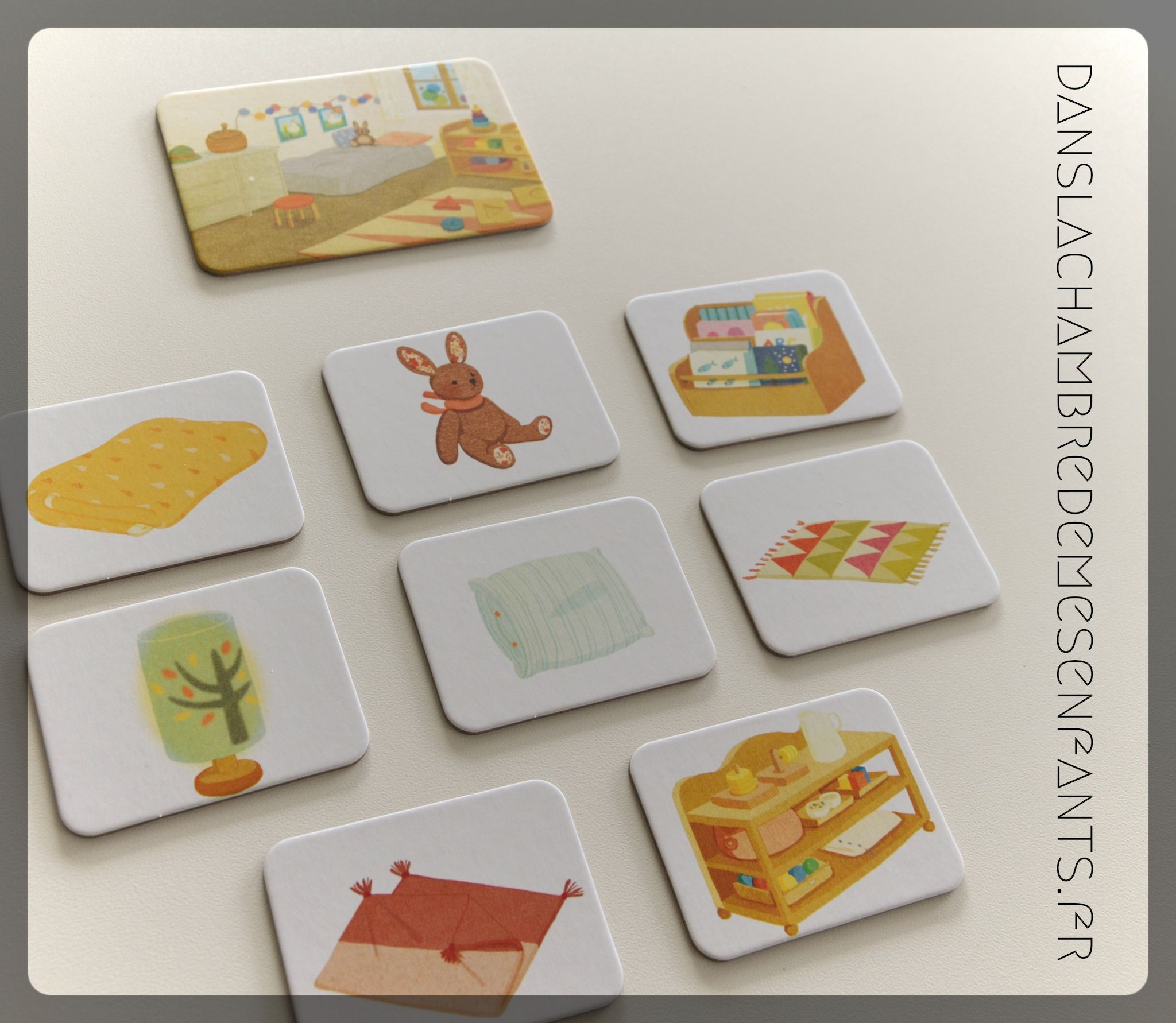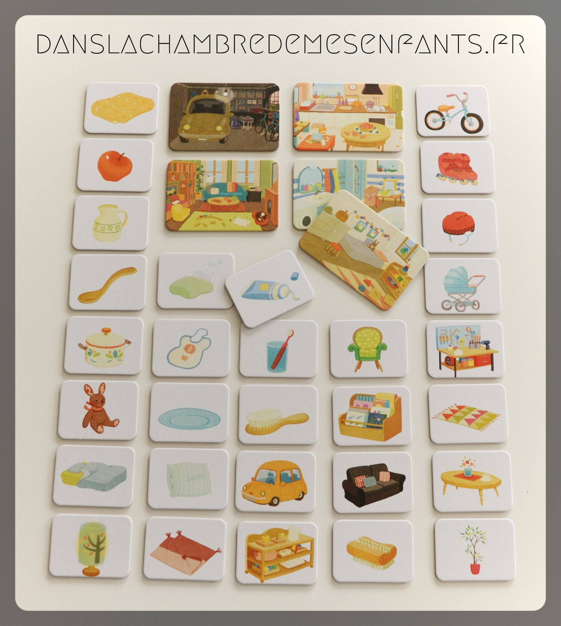 Les cartes comprennent 35 figures illustrées : 30 objets (peluche, savon, canapé…) et 5 pièces de la maison permettant d’aborder cette autre dimension (objet/lieu).