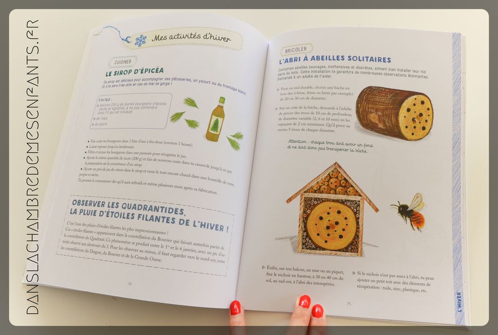 Egalement, des activités de saison sont proposées pour mettre en avant des éléments de la nature : cuisine (recette de spaghetti au fenouil sauvage, du sirop d’épicéa…), créativité (réaliser des œuvres d’art éphémères avec des fleurs…) ou bricolage (abri à abeilles solitaires) et jardinage (semer des herbes folles) ou autre activité d’éveil (écouter le brame du cerf…).