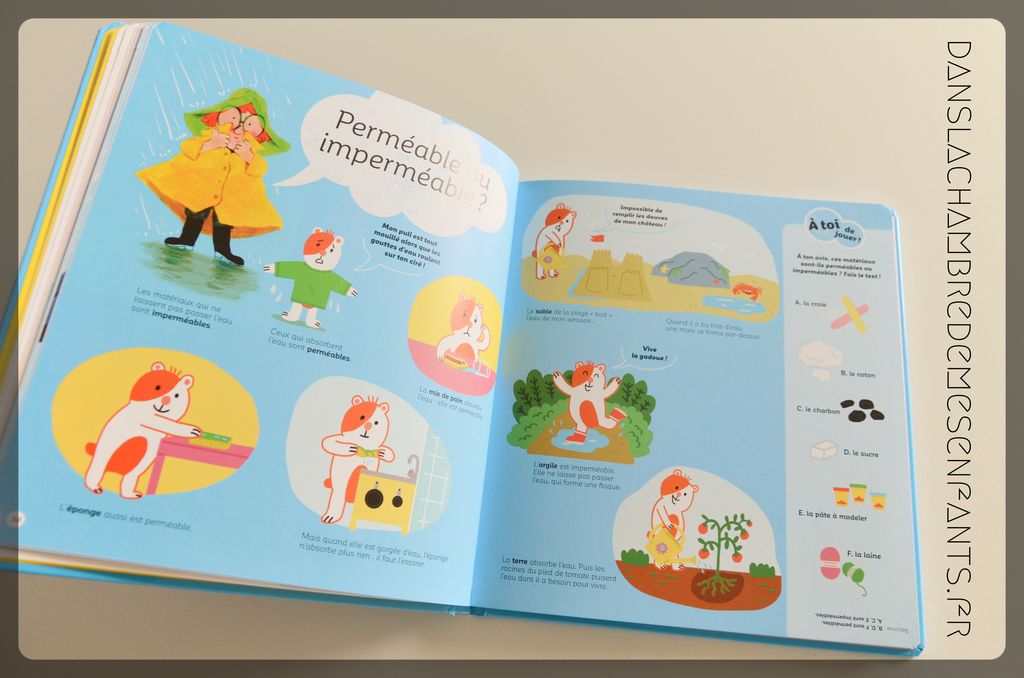Chaque question est traitée simplement et de façon très illustrée avec de grands dessins colorés, voire de photos. Cette présentation est claire et facilite la proximité avec le jeune lecteur. De plus, sa participation est régulièrement sollicitée par de nombreux jeux (ex : test pour comprendre une notion telle que l’imperméabilité), de petites activités (ex : fabriquer un hélicoptère en papier) voire de petites expériences (ex : fabriquer une pile avec un citron).