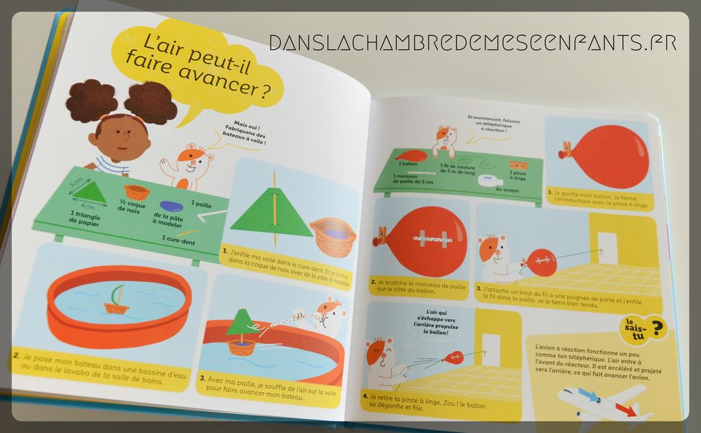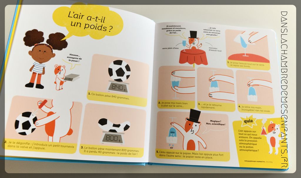 L’avis des enfants : Alex, 8 ans, a rapidement été intéressé par ce livre dont le sujet le passionne. Il connaît une grande partie des notions présentées mais le côté ludique et pratique (expériences) l’a conquis. Je pense que c’est aussi l’occasion de partager des petits jeux scientifiques avec sa petite sœur !