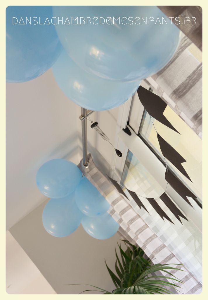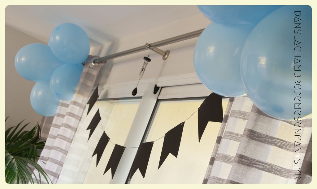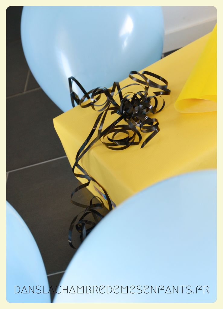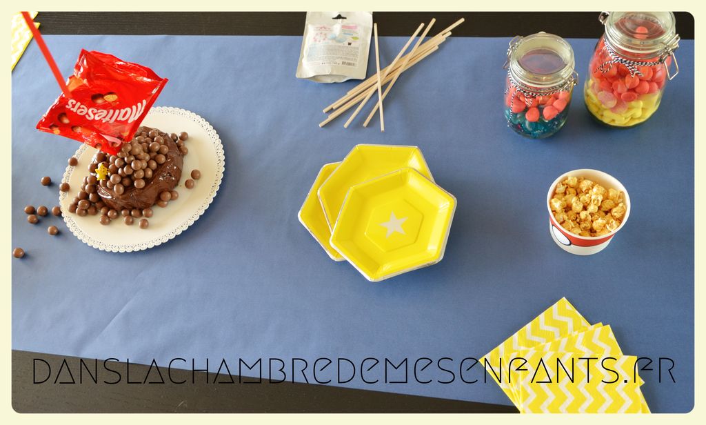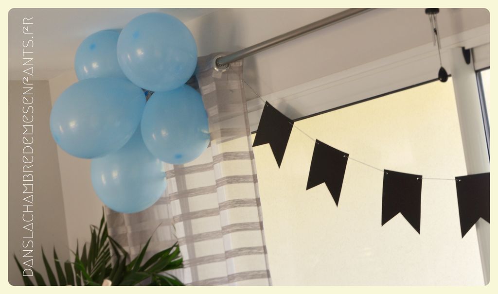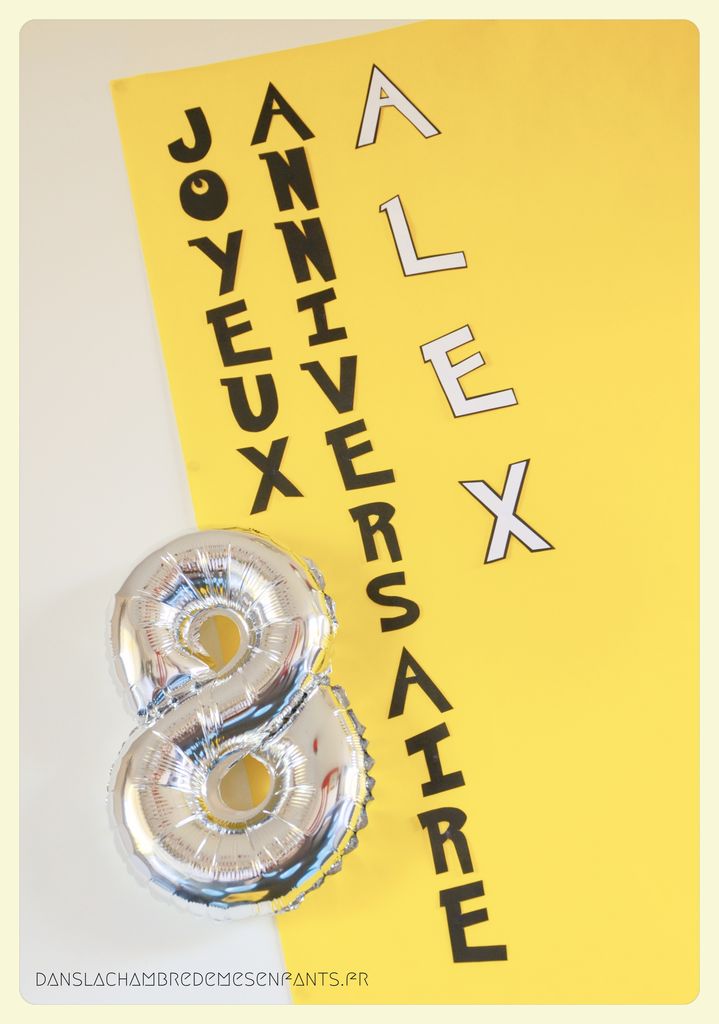 Les incontournables ballons disposés en hauteur pour une décoration simple des volumes tout en rappelant une couleur de base du thème. Alex a tenu à ce que j’ajoute une banderole. J’ai tout simplement réutilisé les guirlandes de l’anniversaire Star Wars déjà à portée de main puisque je leur avais donné une seconde vie pour décorer la chambre de mon fils.