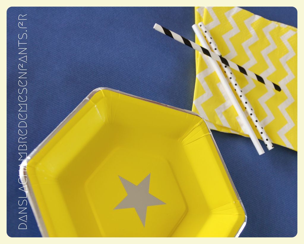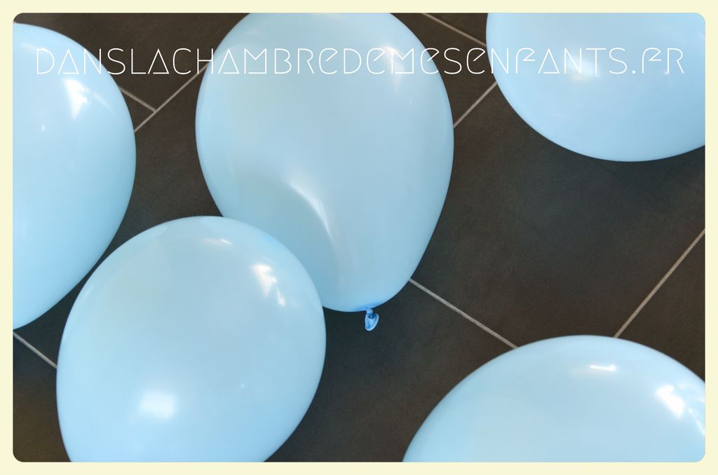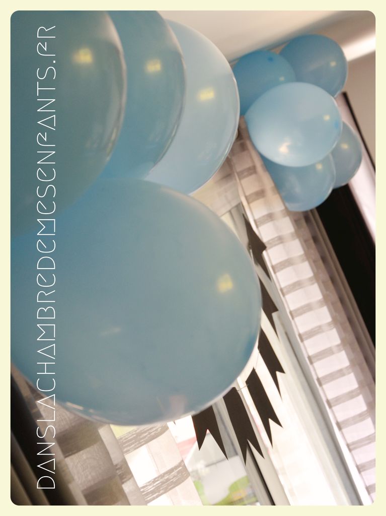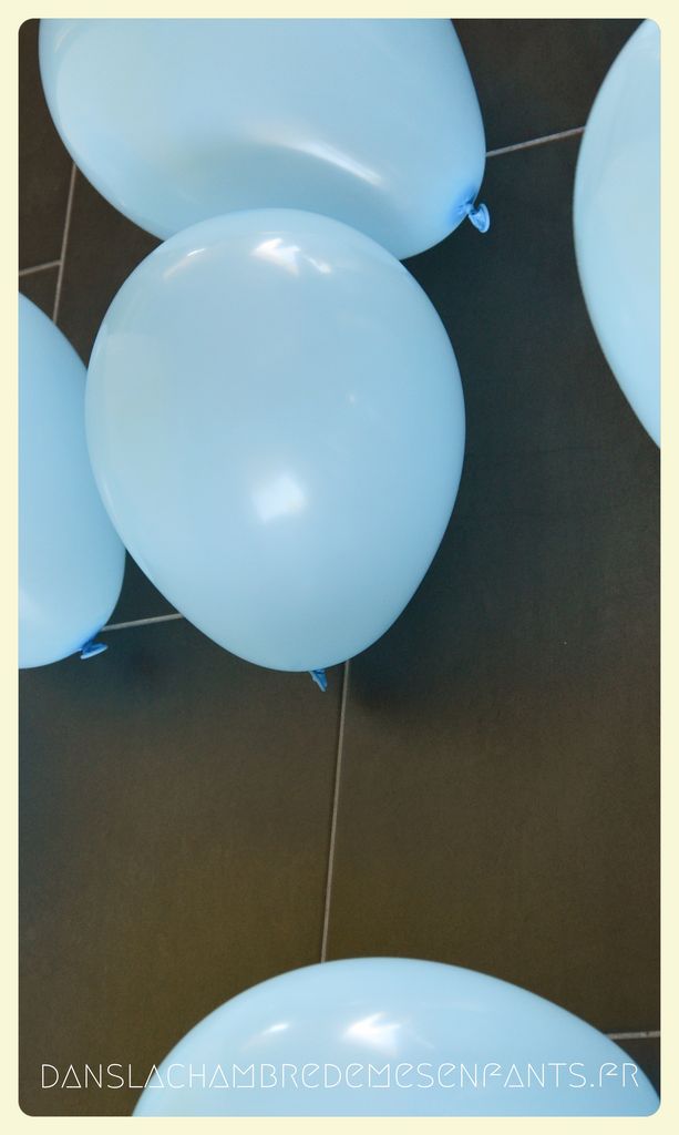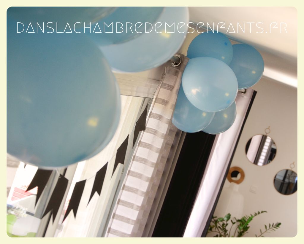 Les incontournables ballons disposés en hauteur pour une décoration simple des volumes tout en rappelant une couleur de base du thème. Alex a tenu à ce que j’ajoute une banderole. J’ai tout simplement réutilisé les guirlandes de l’anniversaire Star Wars déjà à portée de main puisque je leur avais donné une seconde vie pour décorer la chambre de mon fils.