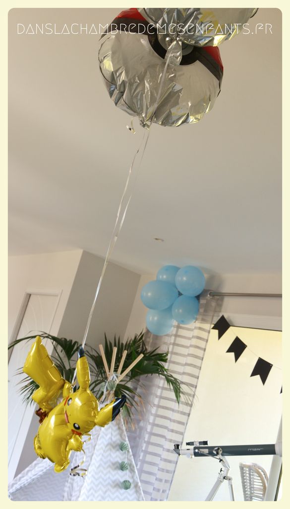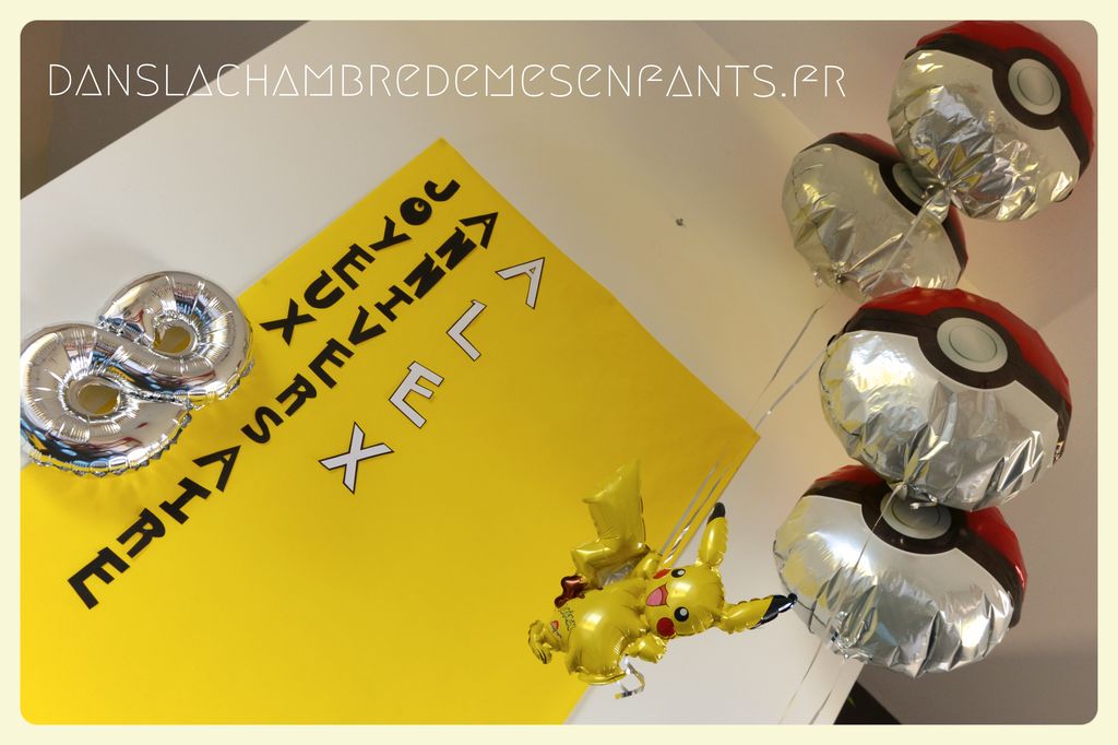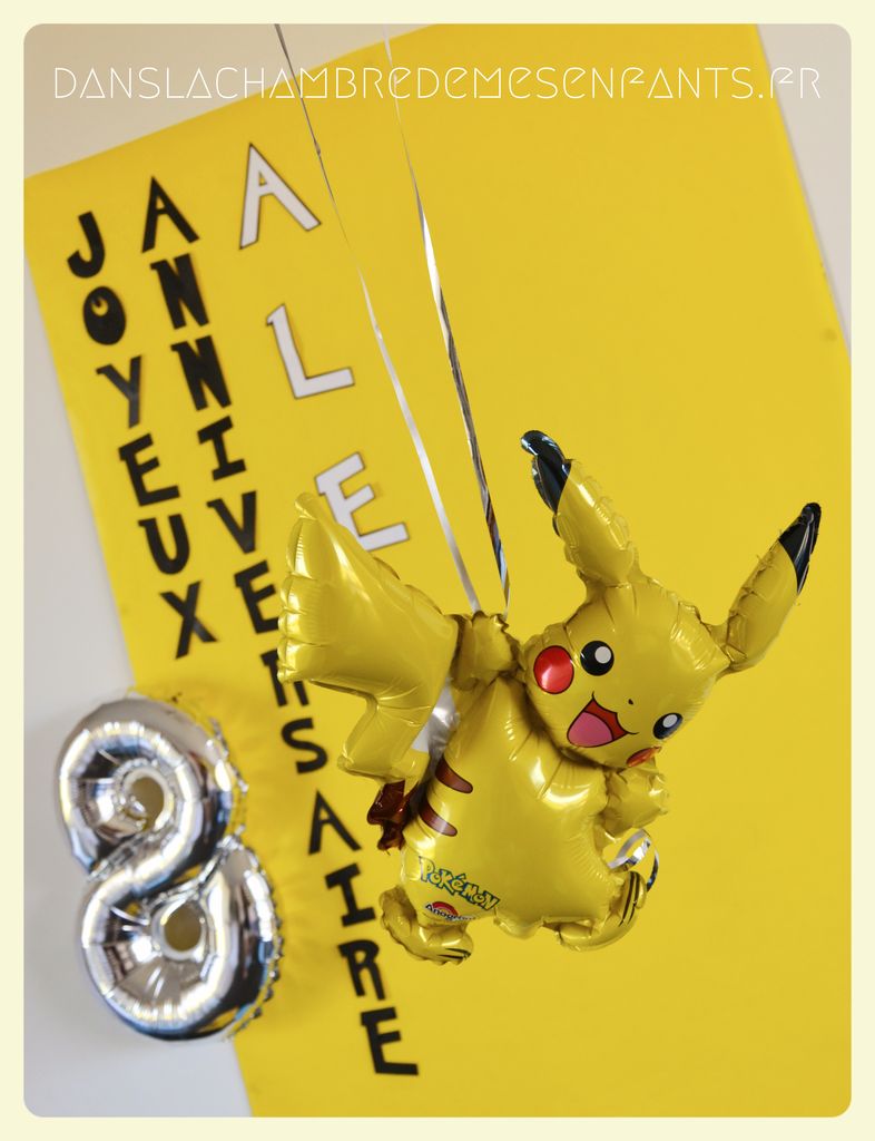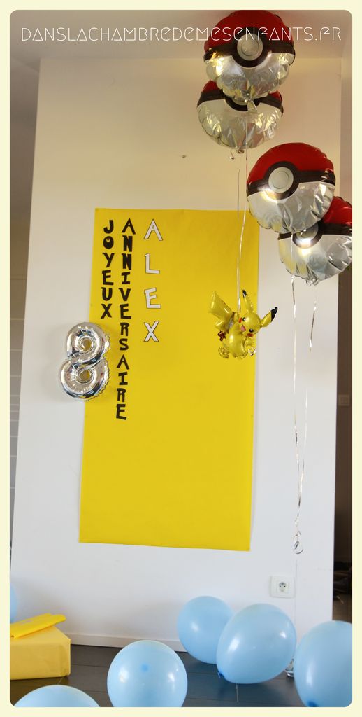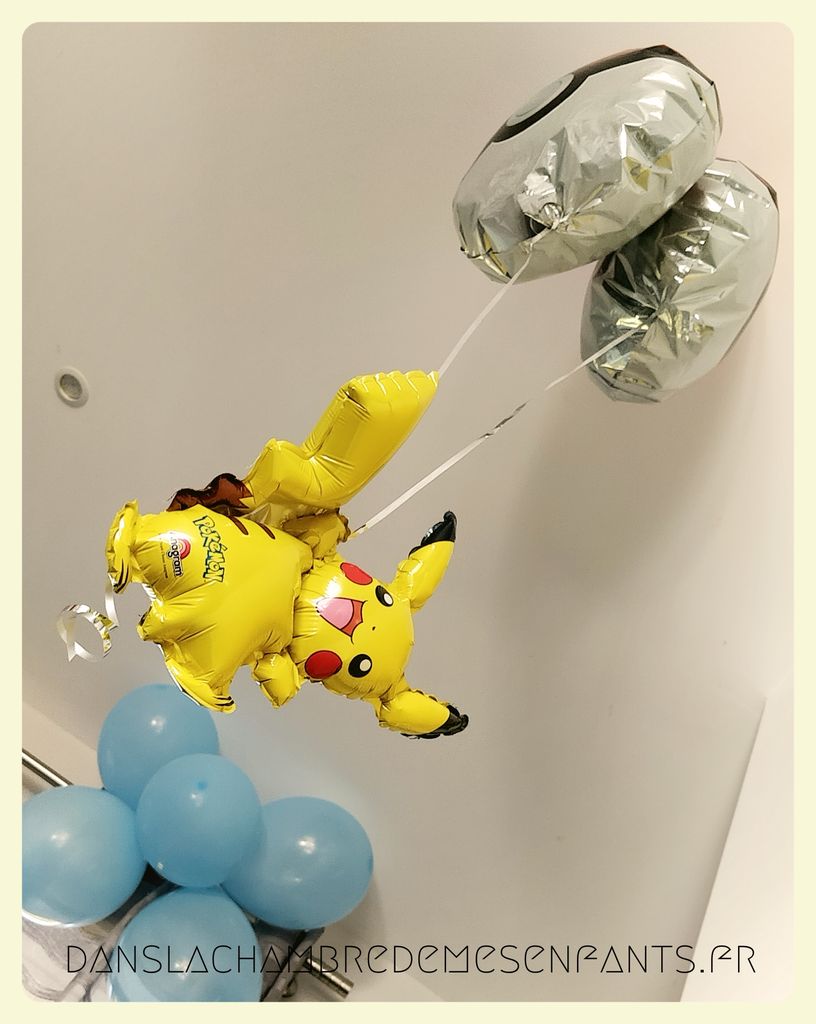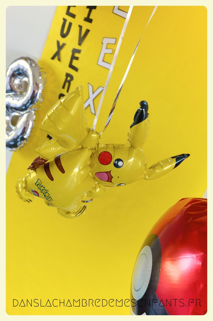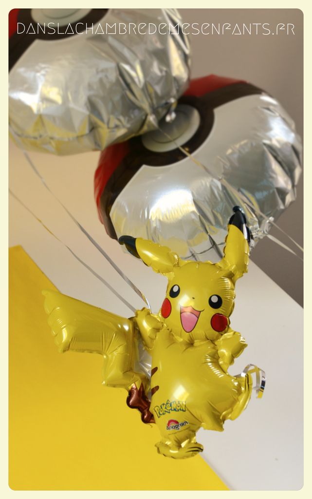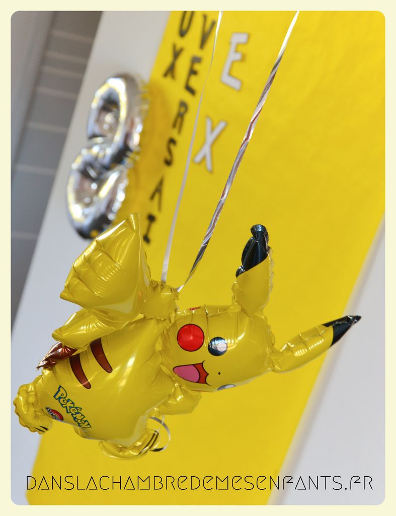 En souvenir, j’ai réalisé un photobooth à partir d’un fond jaune décoré de ballons amusants j’adore ce petit Pikachu qui s’envole avec des ballons Pokéball !