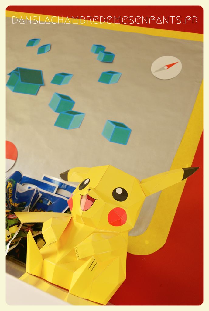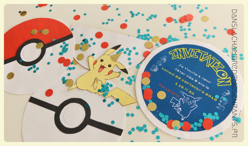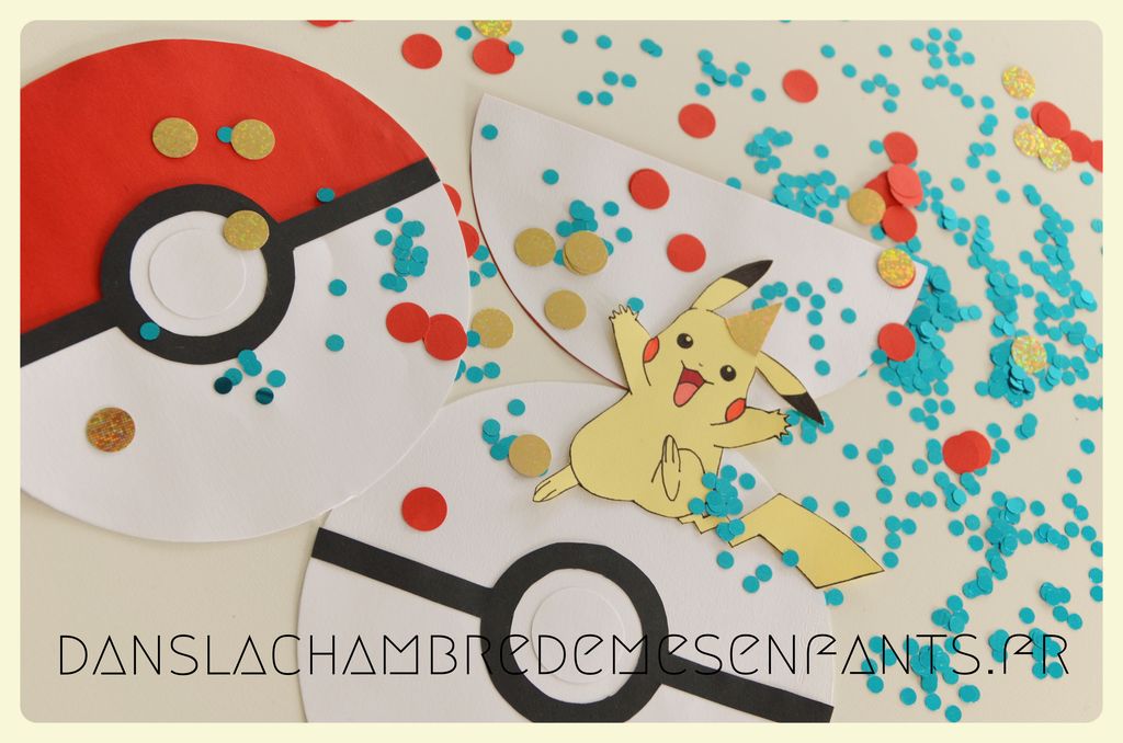 Pour qu’Alex s’approprie davantage sa fête d’anniversaire, je lui ai demandé d’imaginer sa carte d’anniversaire. Nécessitant un petit coup de pouce, on a improvisé, Mélanie, Alex et moi, un bref brainstorming : « un Pikachu qui fait la fête », « une forme particulière »… et voilà notre carte Pokéball inventée. Cette Pokéball s’ouvre sur un Pikachu et un tas de confettis, donnant déjà le ton de la fête !