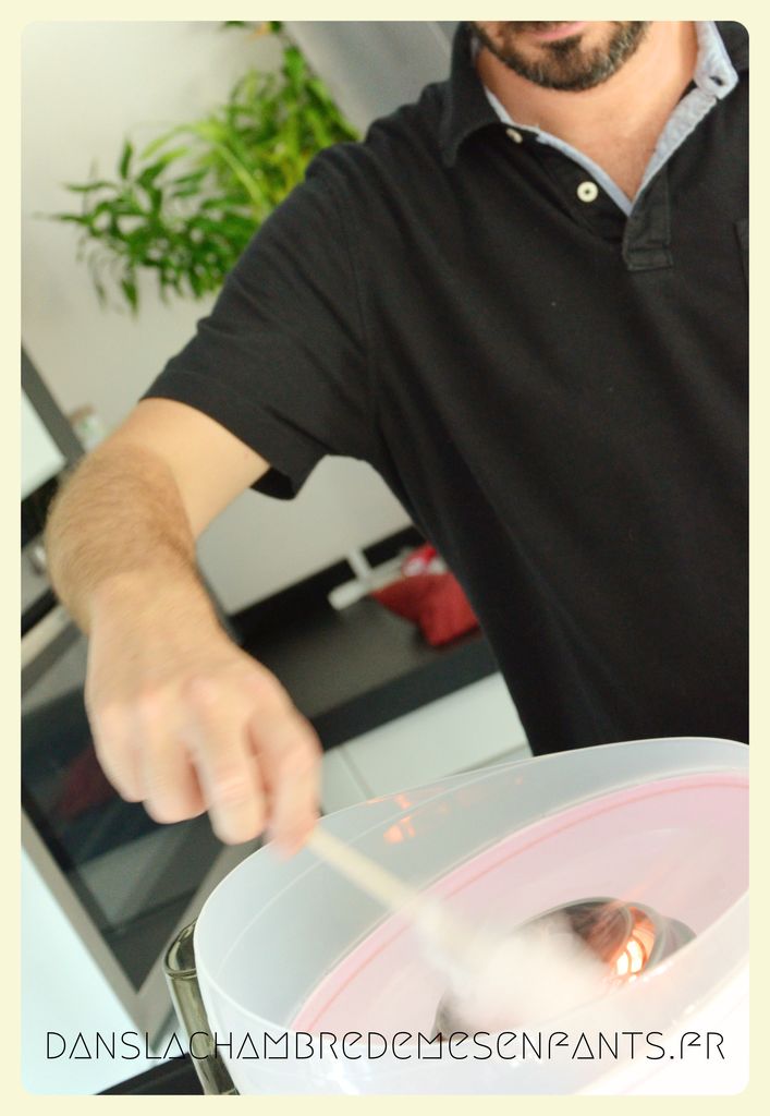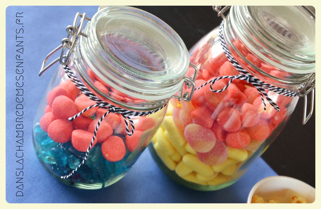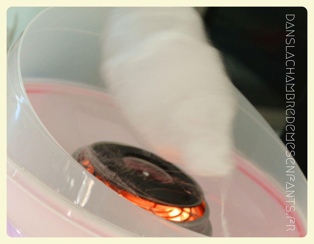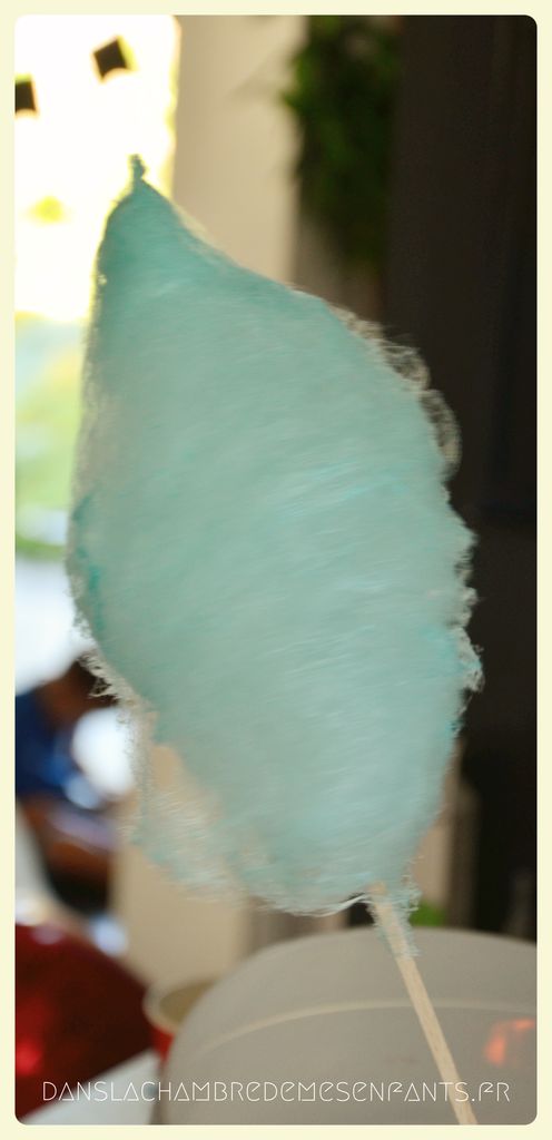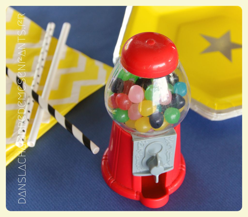 Pour les accros, j’ai présenté d’autres Malteser (le surplus) dans des petits ramequins. Des pop-corns pour mon p’tit fan et j’ai aussi pensé à la barbe à papa qu’il espérait tant, goût coca pour rappeler sa boisson de cet été. J’ai été un peu déçue par cette marque de préparation à barbe à papa car le parfum était peu marqué, manquant aussi de sucre… bref, assez fade. Bien sûr, je ne pouvais pas faire une sweet table sans bonbons, notamment dans le mini distributeur qu’Alex a voulu ressortir pour l’occasion.