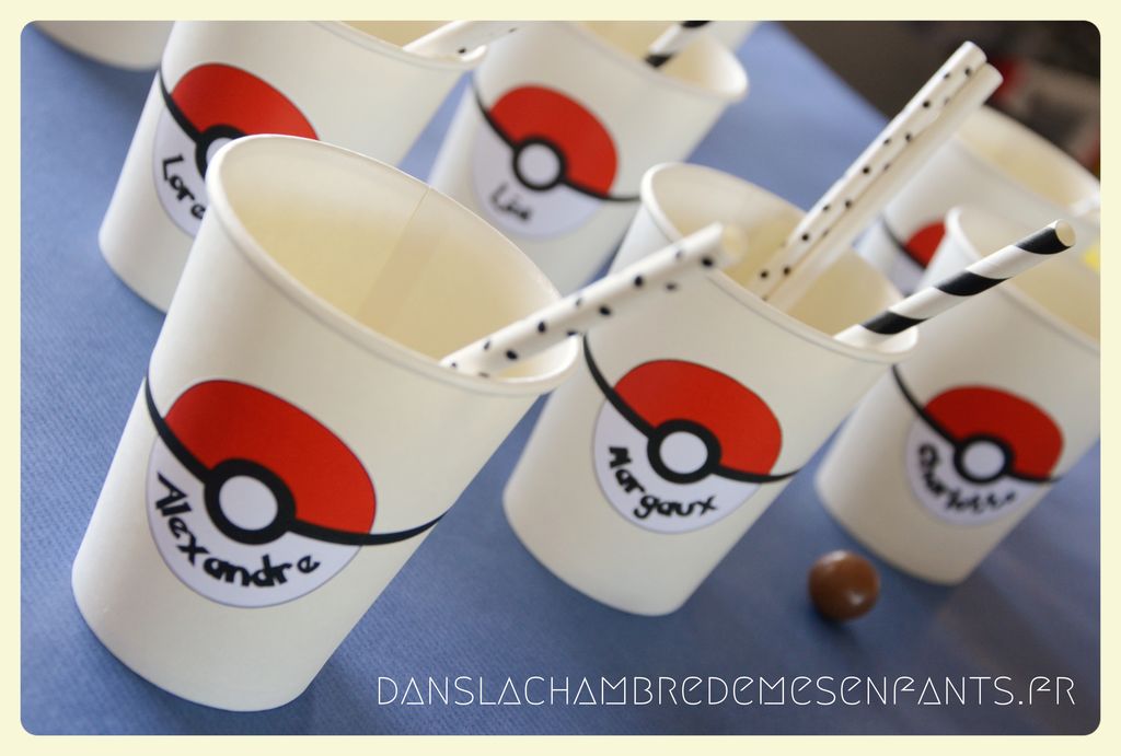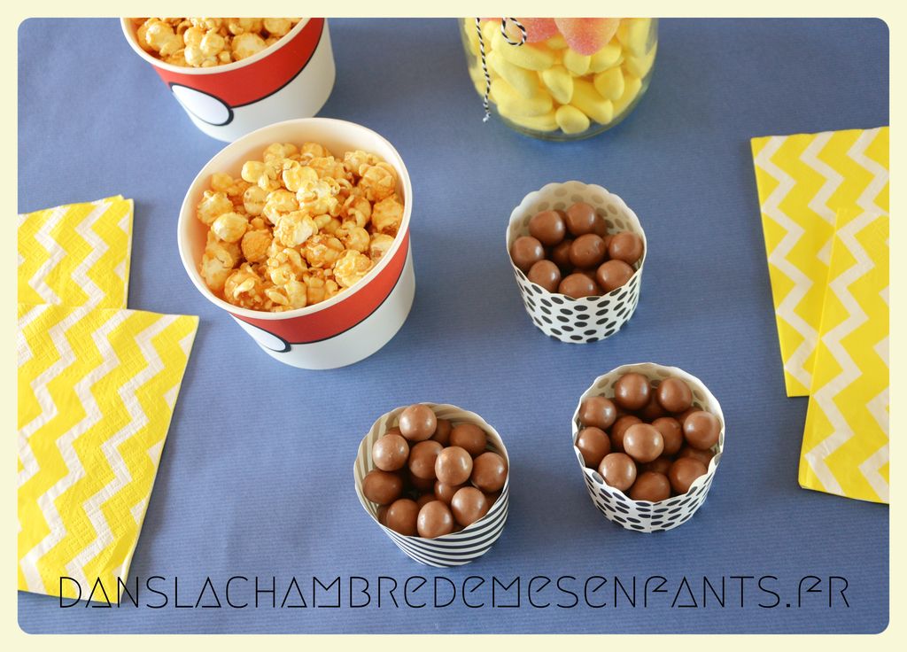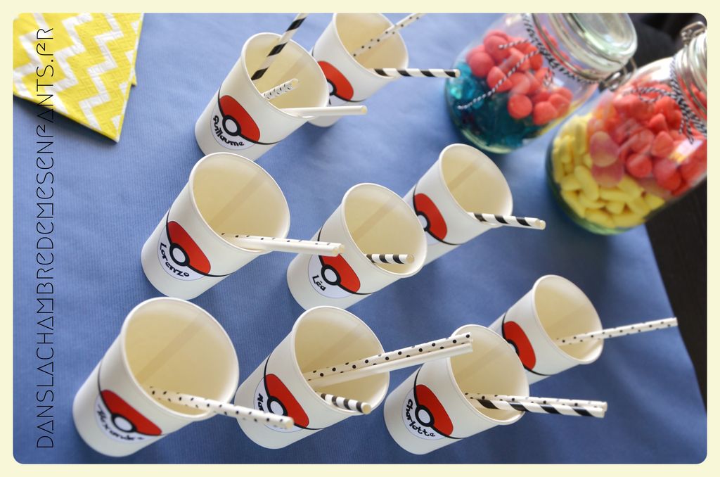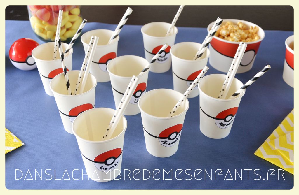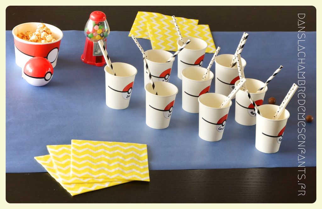 J’ai aussi dessiné sur ordinateur des décorations rappelant les Pokéball pour les gobelets personnalisés et les pots à pop-corn, me permettant d’acheter des contenants cartonnés vierges, esthétiques, peu coûteux et dont le surplus sera facilement utilisé pour un autre thème.