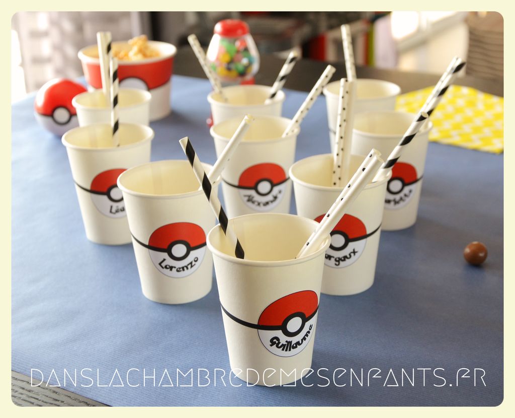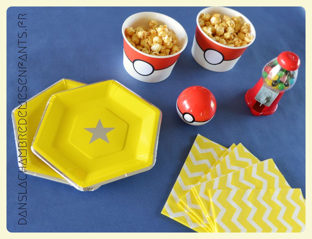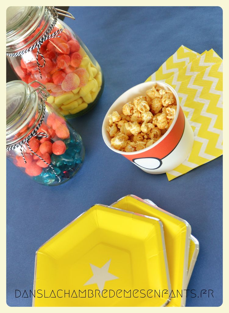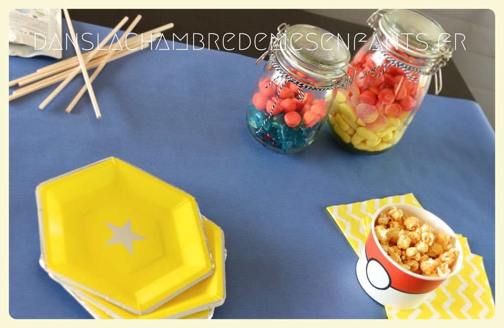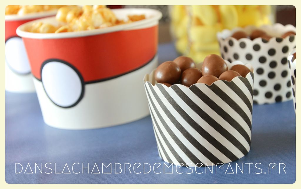 J’ai aussi dessiné sur ordinateur des décorations rappelant les Pokéball pour les gobelets personnalisés et les pots à pop-corn, me permettant d’acheter des contenants cartonnés vierges, esthétiques, peu coûteux et dont le surplus sera facilement utilisé pour un autre thème.