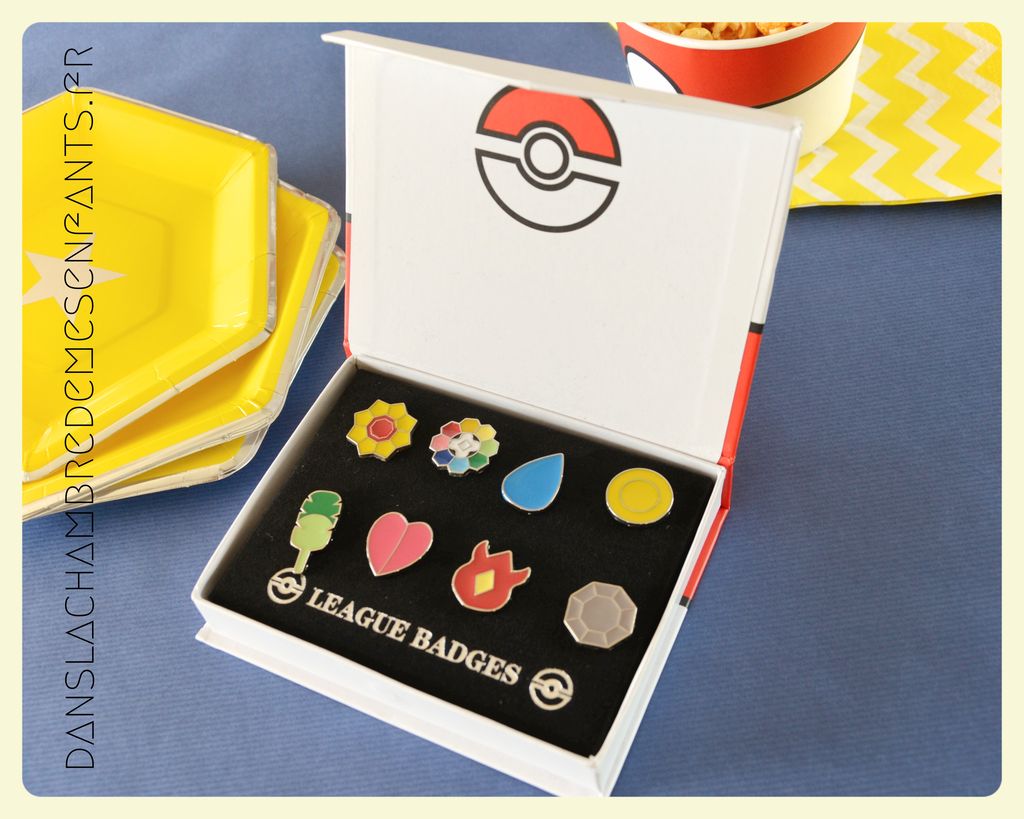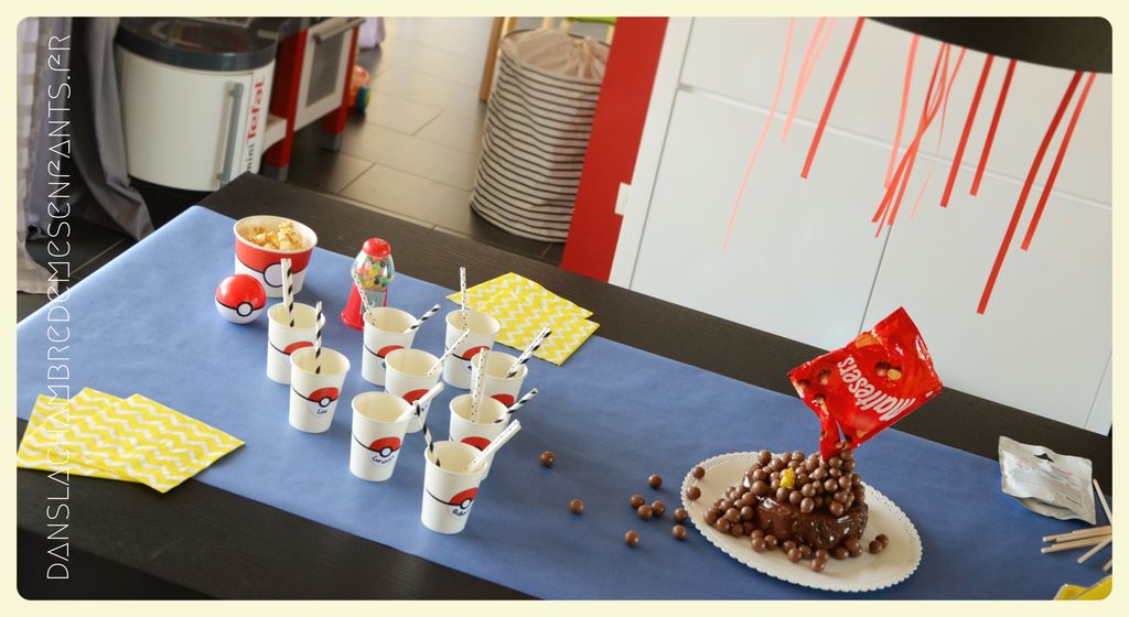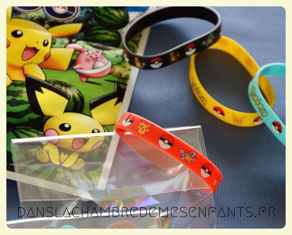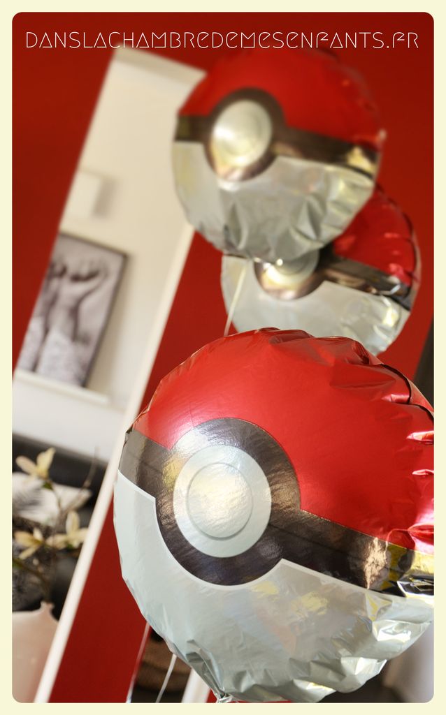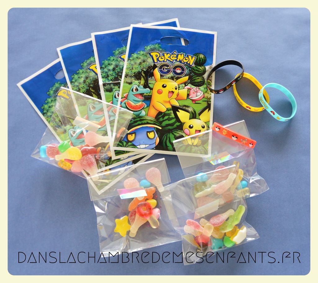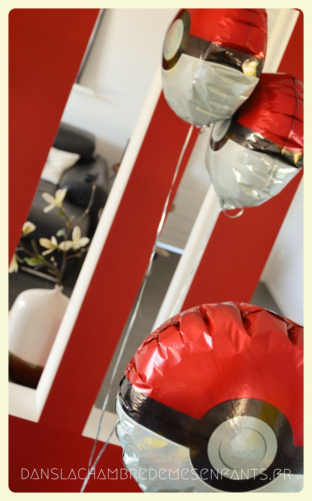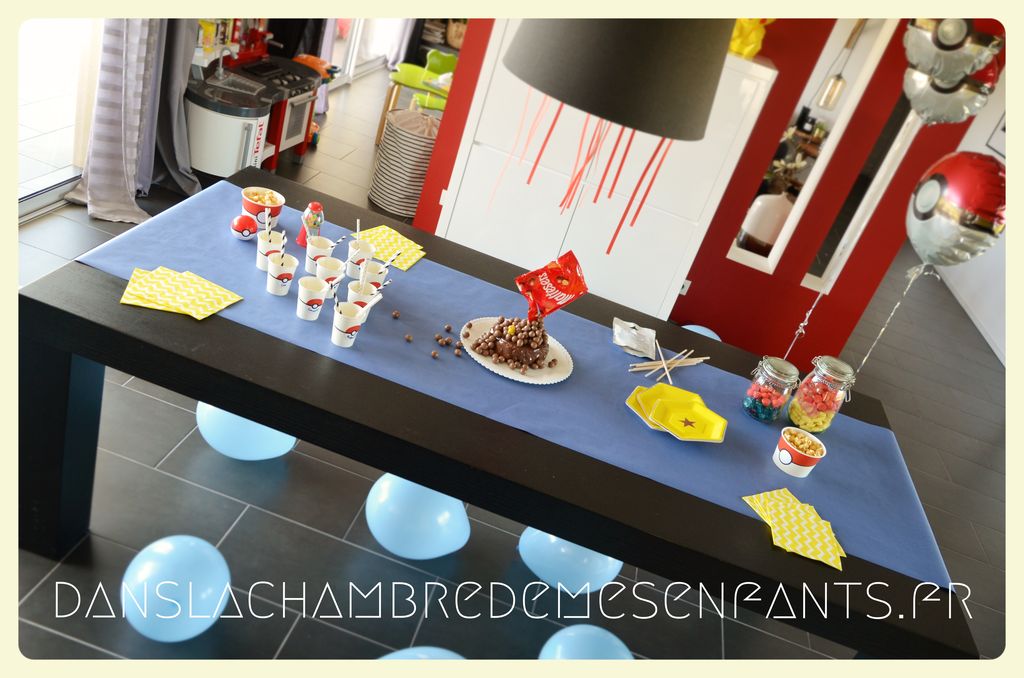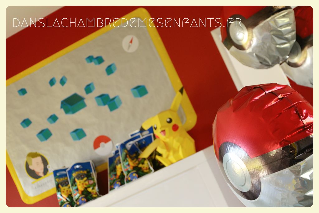 Pour l’anniversaire entre copains, j’ai prévu les traditionnels sachets de bonbons avec un bracelet Pokémon. Pendant la fête, ils ont eu droit à une chasse aux Pokémon dans le jardin : les figurines étant petites, je les ai placés dans des ballons de couleurs, parfois uniquement remplis d’air ou de farine sinon d’eau. La plupart des ballons ont éclatés avant l’heure au moment de les placer dans le jardin (!) mais cela a amusé les enfants tout de même, surtout en découvrant le ballon XL dans le salon rempli de nombreux Pokémon. Après un petit quiz, ils ont eu droit à un pin’s des familles de Pokémon.