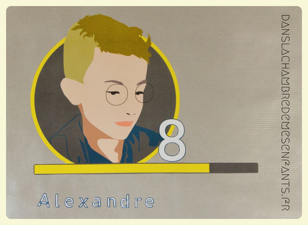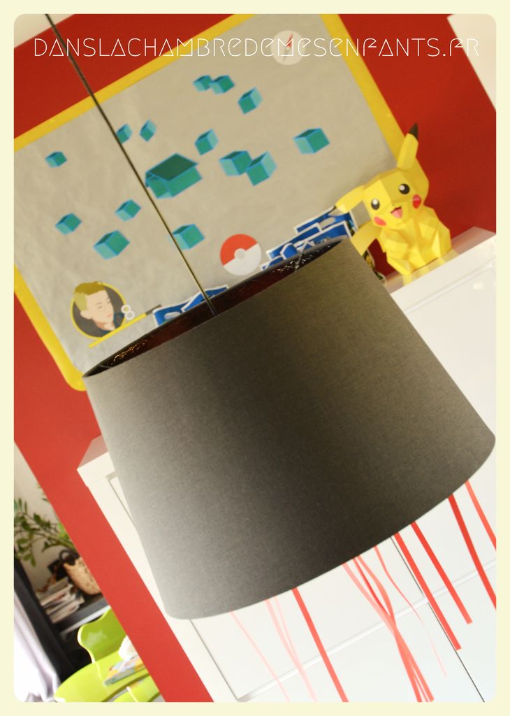 Voulant davantage décorer en hauteur et habiller le grand mur rouge en position centrale, j’ai improvisé un écran du jeu vidéo : la carte de repérage des Pokémon. J’ai donc donné une deuxième vie au portrait d’Alex en adaptant les tons et j’ai bricolé le reste.