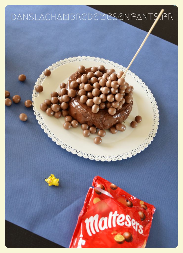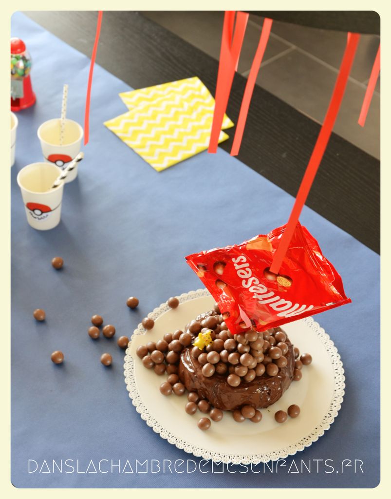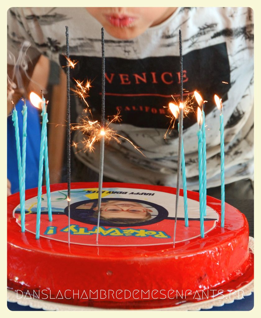 Bien entendu, une telle déco a l’inconvénient de limiter les possibilités d’ajout d’éléments comme les bougies !!! J’ai fait un rappel avec une figurine Pikachu dont la position ne pouvait pas être mieux choisie quel bon hasard ! La bougie unique était très fine et positionnée une fois l’emballage ôté pour une question de sécurité. Ce gâteau a rencontré un franc succès et, même moi, je l’avoue, je n’étais pas peu fière de mon p’tit bricolage de dernière minute.