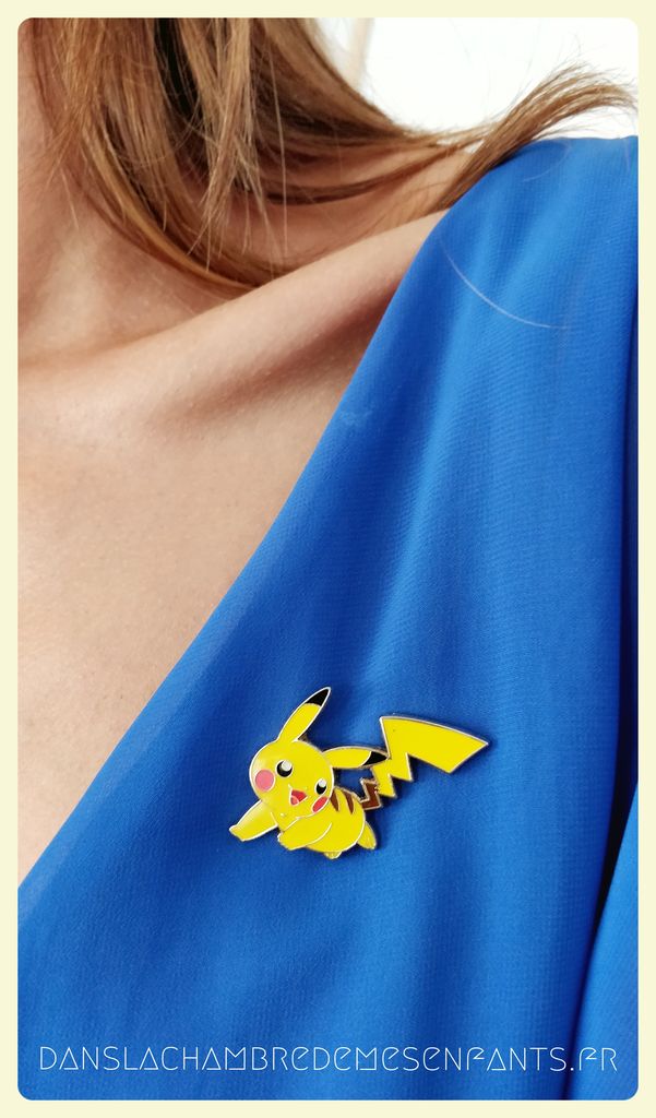 Enfin, je n’ai pas résisté à visiter le placard d’Alex pour dénicher un élément qui me mettrait en accord avec la thématique : un petit pin’s qui contraste bien avec le bleu de ma robe 🙂 Autre réutilisation : le papertoy Pikachu de 404 éditions a trouvé sa place d’honneur dans cette décoration !
