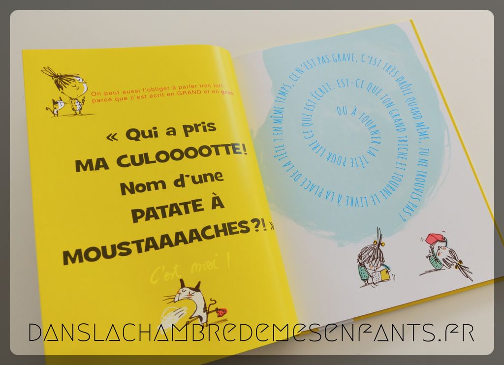 L’avis des enfants : Alex, 8 ans, a découvert ce livre non pas en écoutant son histoire mais en entreprenant lui-même la lecture à voix haute pour sa petite sœur, Emi, 3,5 ans. Il vient de commencer des cours de théâtre et j’ai trouvé que ce texte se prêtait bien à une interprétation très vivante en veillant à respecter les intonations. Cet « exercice » a amusé mon fils mais il a souvent été dérouté par la présentation du livre, peu classique. Le titre les a de suite fait rigoler surtout le passage sur la culotte, il faut le dire même s’ils n’ont pas pris le temps de s’attarder sur les images, participant beaucoup à la mise en scène du texte.