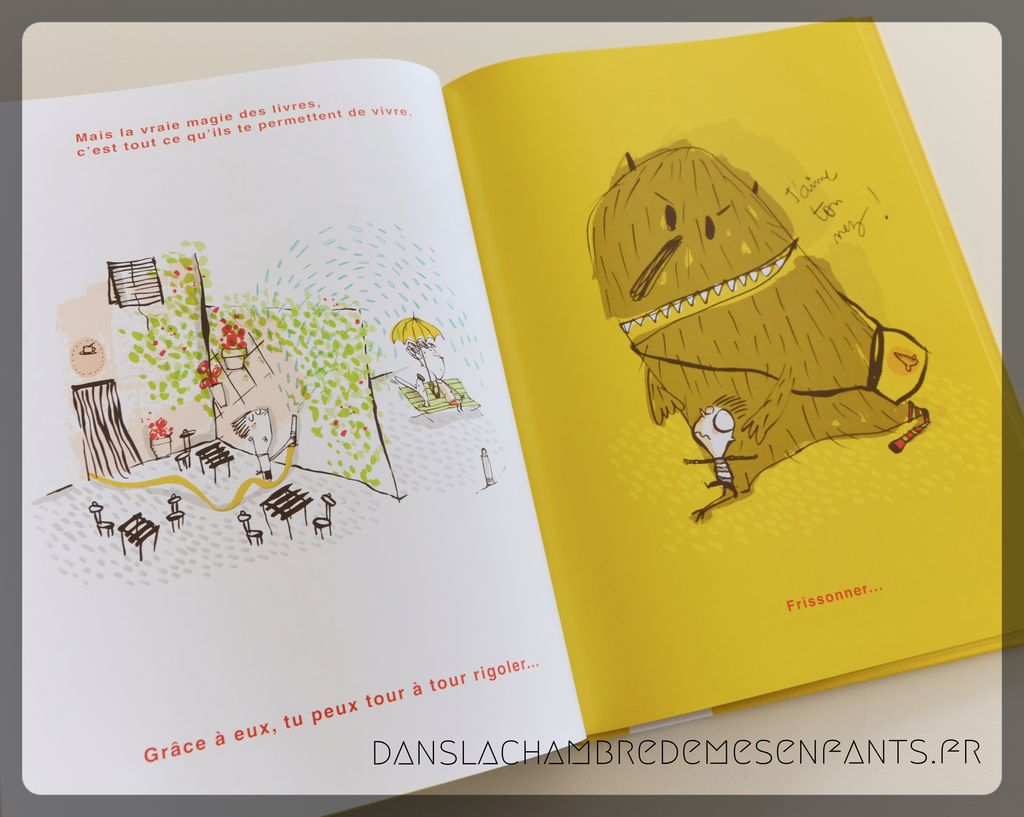 Alors un livre, ça nous apporte quoi ? De l’humour en imaginant que « Le mammouth de Mamie mange des marshmallows avec la maîtresse », à inscrire l’imprononçable, à lire parfois en tournant si l’auteur a envie de s’amuser avec « le grand » (ndlr : l’adulte lecteur), à s’amuser avec l’illustrateur pour inventer « un monstre vert avec une langue en trompette, deux petites couettes et qui pète des cacahuètes » par exemple, etc. Bref, c’est une liberté de l’esprit, un voyage, un partage : une jolie vision qui donne vie à un ouvrage qui parle aux enfants.