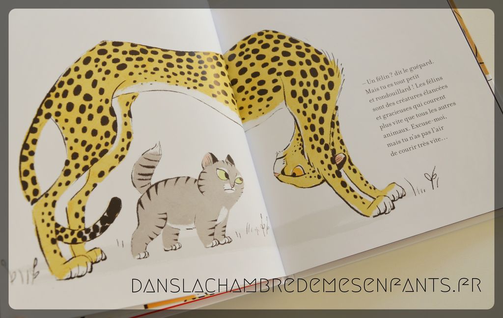 Autre album, autre sujet, autre personnalité : il y est question d’un petit chat qui soutient être un félin, provoquant la surprise, le rire, le rejet, l’étonnement puis l’acceptation. Ces phases se lisent facilement grâce aux jolies et grandes illustrations.