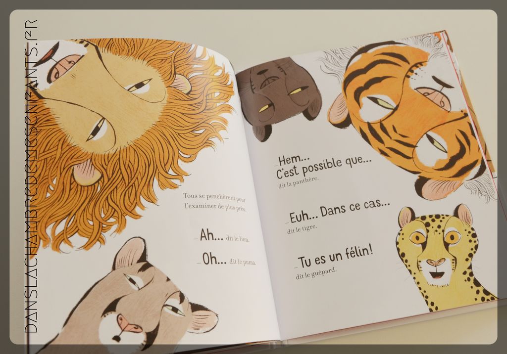 En effet, les célèbres félins sauvages (tigre, lion, panthère…) finissent par prendre conscience de leurs différences et, en même temps, de leurs points de ressemblance avec ce si petit et inoffensif animal. « Je suis un félin. Comme vous ! », une simple affirmation qui aura de grands effets pour que l’identification se fasse au fur et à mesure que l’on avance dans la lecture. Une famille est faite de similitudes et de tant de différences pour s’unir grâce à l’acceptation.