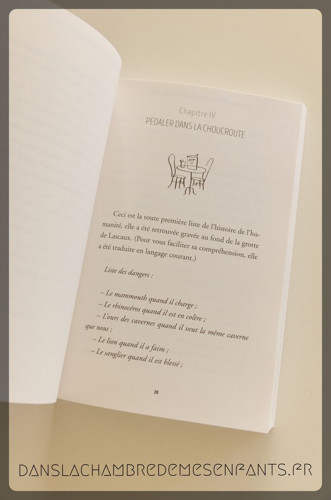 La lecture est marquée par l’humour, appuyée par les grandes illustrations au style très graphique. Rien n’est vraiment très classique ici, pas même le texte qui finit à l’autre bout de la page, qui tourne… ou encore l’absence de pagination.