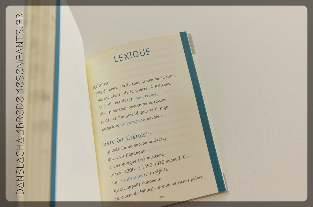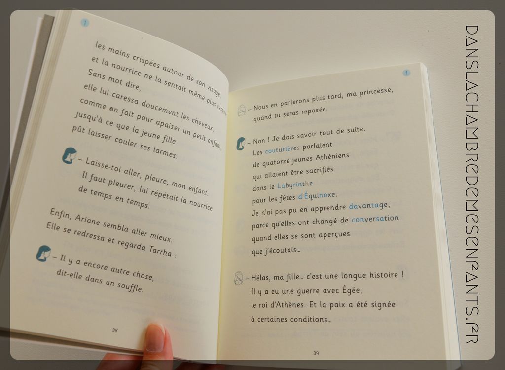 On y apprend notamment que ce récit n’est qu’une des versions de la légende puisque c’est ici Ariane qui est en position centrale : la fille de Minos, roi de Crète, découvre les lourds secrets de sa famille, dont découlent le Minotaure emprisonné et les sacrifices des jeunes athéniens. Poussée par un élan d’empathie, elle décide de changer l’histoire, devant ainsi fuir son père. L’information complémentaire, en fin d’ouvrage, est très précieuse pour en savoir plus notamment sur l’imbrication des légendes avec l’arbre généalogique d’Ariane… future épouse d’un Dieu !