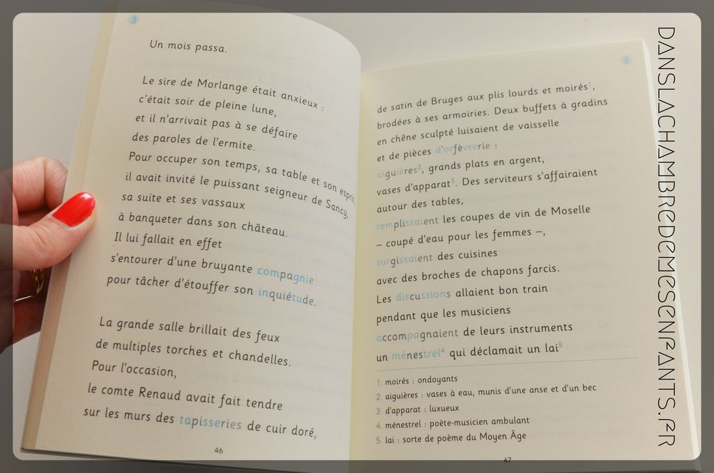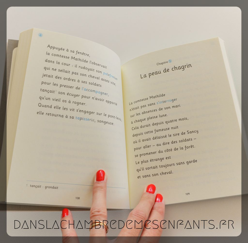- une mise en page adaptée pour un meilleur déchiffrage : changement de page à chaque changement de scène, définition de mots difficiles en bas de page, séparation du texte et des illustrations, mise en couleurs des mots longs ou complexes et texte aéré,
