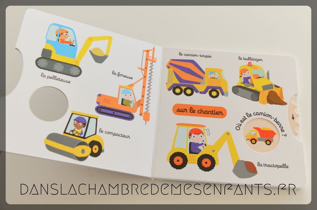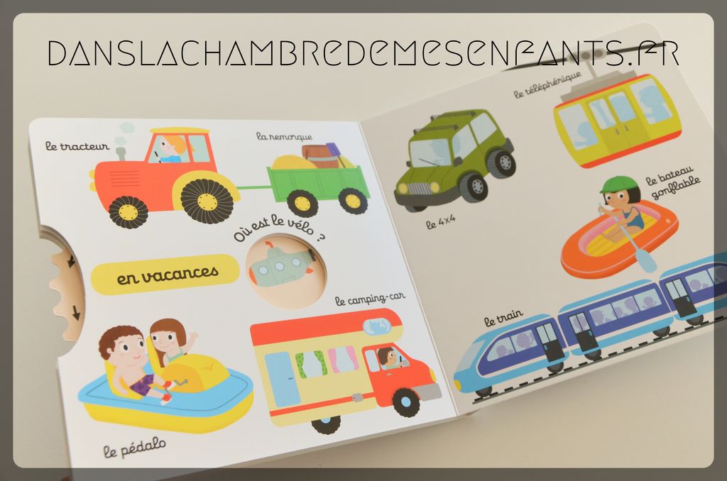 Ce titre présente les véhicules par catégorie : « En ville » (le bus, la voiture de police…), « Sur le chantier » (la pelleteuse, la tractopelle…), « Sur l’eau » (le bateau à moteur, la péniche…), « En vacances » (la remorque, le train…). Ce sont des véhicules qui intriguent nombre d’enfants, notamment du fait des sons qu’ils produisent, et qu’ils rencontrent dans leur vie quotidienne ou plus occasionnellement. Mon fils était, à l’époque, particulièrement intéressé par tout véhicule motorisé !