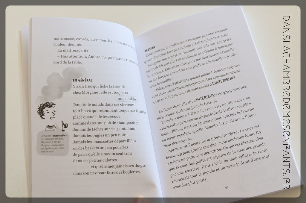 Il est question ici d’une narratrice dyslexique qui correspond avec son frère aîné, parlant de son quotidien avec beaucoup de spontanéité et d’humour. Bien évidemment, un tel programme annonce une lecture très dynamique avec petits dessins en marge, annotations… mais il ne s’agit pas que d’un effet de style car cette double lecture permet de corriger gentiment Ambre, ce qui est aussi l’occasion de jeux de mots amusants.