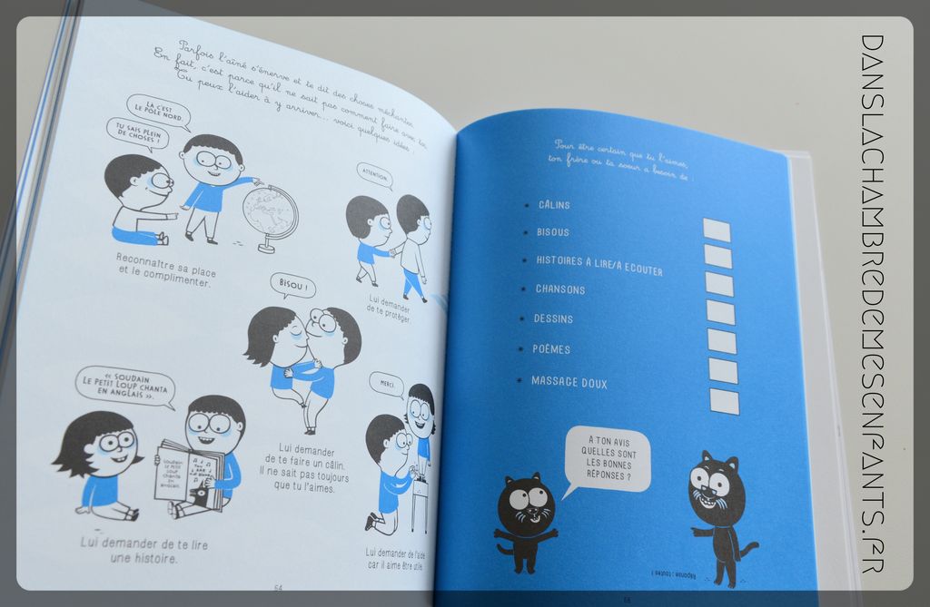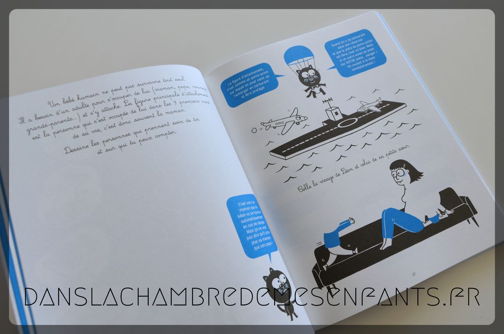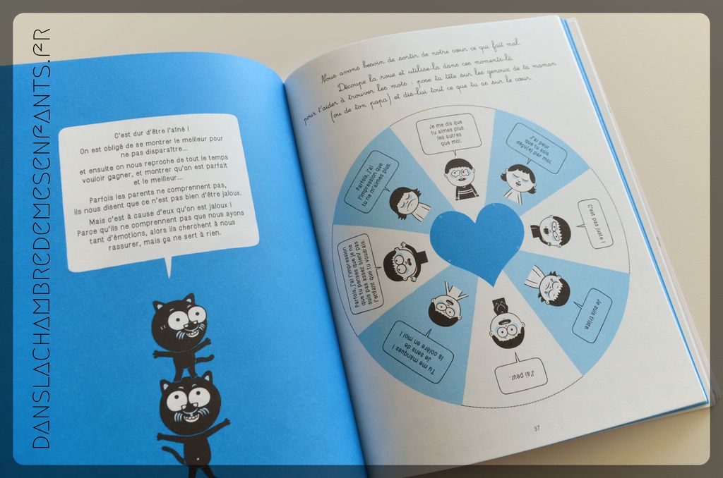 Comme d’habitude, ce cahier nécessite peu de matériel (uniquement des fournitures de papeterie tels qu’un crayon, des ciseaux, de la colle…) pour entreprendre des jeux et des ateliers assez brefs. Il s’agit d’un cahier ludique et dynamique qui fait varier des pages d’expression (ex : « Dessine ta famille »), « d’exercices » (ex : « Les parents disent qu’ils nous élèvent « pareil », mais ce n’est pas vrai ! Ce n’est pas pareil d’être premier, l’enfant du milieu ou le petit dernier ! Colorie les scènes. »), de jeux (ex : « Quand on ne peut pas partager ses émotions, ça se transforme en… Découvre le mot caché en coloriant selon le code [ndlr : couleur] »), d’activités (ex : « Découpe les bons de la page de droite pour demander à ta maman ou à ton papa ce qui te fera du bien pour te sentir aimé. [« Une promenade tous les deux »…] Puis […] écris sur les bons tout ce que tu aimerais pour te sentir aimé et donne-les à tes parents. »). L’ouvrage se termine par des stickers (utiles pour certains jeux) et un livret à assembler pour expliquer la démarche aux parents.