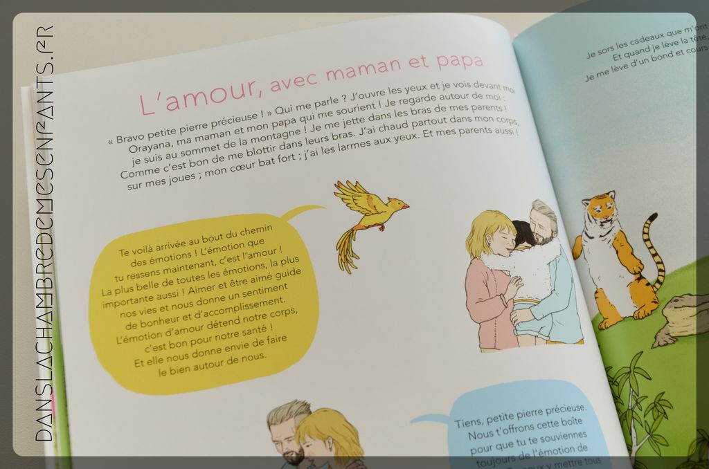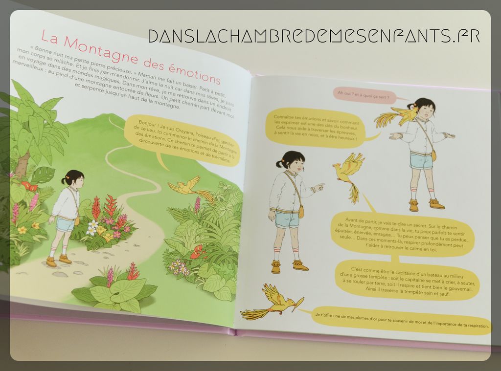 Cet ouvrage propose de découvrir les émotions à la façon d’un voyageur qui apprendrait de lieux nouveaux. Aussi, c’est en suivant une petite fille, guidée par Orayana, l’oiseau d’or gardien des lieux, que l’on arpente la montagne des émotions. C’est un endroit qu’elle retrouve dans ses rêves et qui est régulièrement expliqué à l’appui d’exemples concrets, en invitant l’enfant à se projeter sur ces situations pour une meilleure compréhension (ex : « Tu peux jouer à la peur avec un adulte, avec des peluches ou en faisant du théâtre : un chien te hurle dessus derrière une grille, tu pars dormir pour la première fois chez un copain. Invente d’autres situations qui font ressentir la peur ! »).