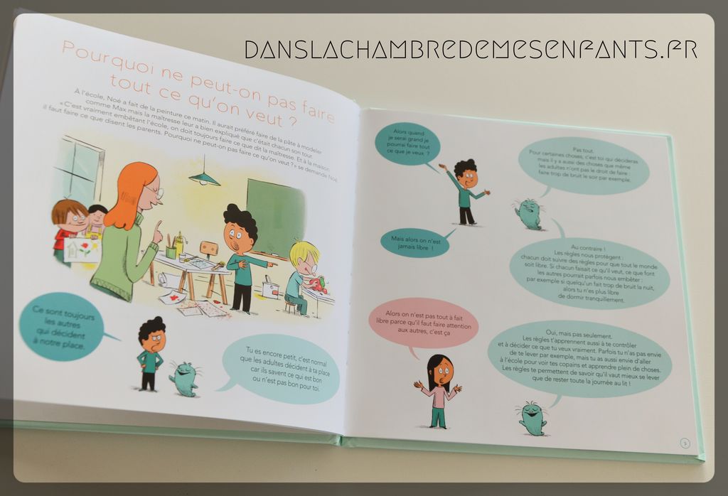- Pourquoi ne peut-on pas faire tout ce qu’on veut ? : « A l’école, Noé a fait de la peinture ce matin. Il aurait préféré faire de la pâte à modeler comme Max mais la maîtresse leur a bien expliqué que c’était chacun son tour. « C’est vraiment embêtant l’école, on doit toujours faire ce que dit la maîtresse […] Alors quand je serai grand je pourrai faire tout ce que je veux ? Pas tout. Pour certaines choses, c’est toi qui décideras mais il y a aussi des choses que même les adultes n’ont pas le droit de faire : faire trop de bruit le soir par exemple. » […]