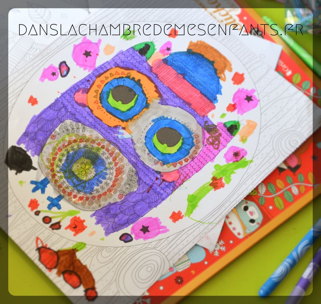 L’avis des enfants : Emi n’a pas attendu de finir le 1er cahier pour entamer celui-ci ! Elle aime particulièrement l’aspect brillant des stickers et les tons vifs qui correspondent à ceux qu’elle aime utiliser pour ses coloriages. La créativité de ma petite artiste y a trouvé de l’inspiration car elle n’a pas souhaité colorier systématiquement les zones blanches, dessinant ses propres bonhommes pour personnaliser ses œuvres !