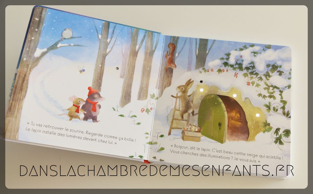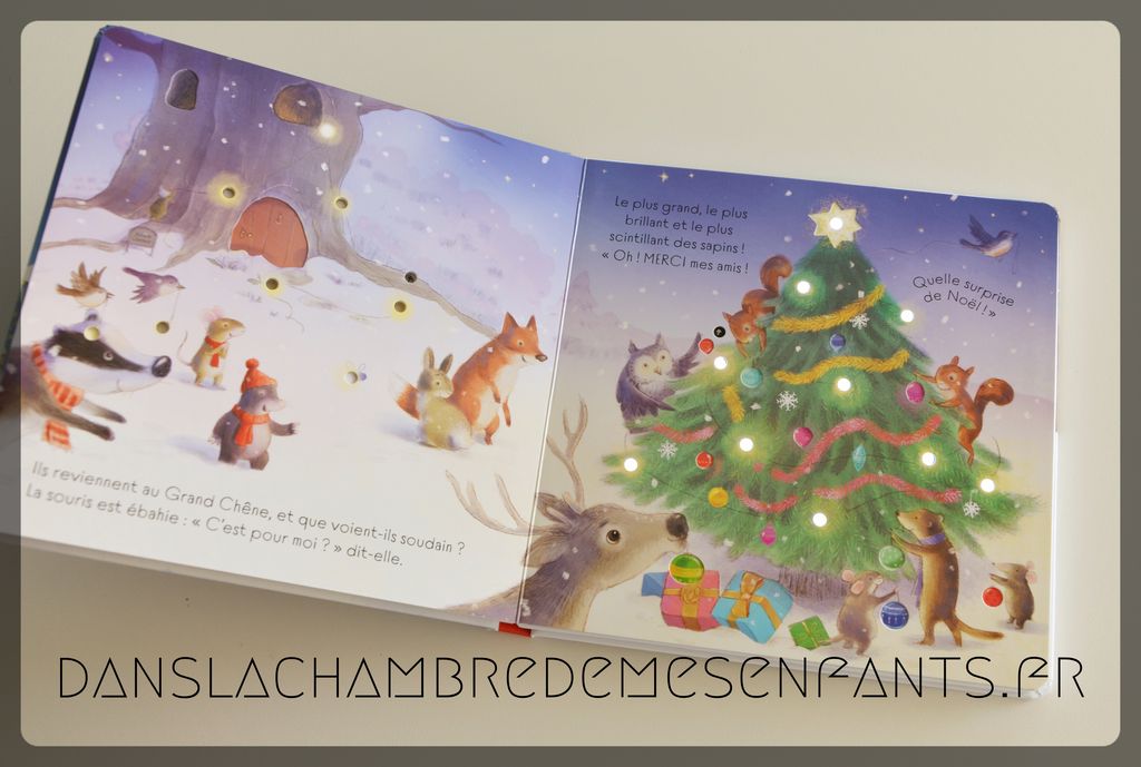 A la veille de Noël, la souris se sent triste alors la taupe décide de lui faire découvrir la féerie des lumières en cette saison. De retour chez elle, elle découvre la surprise préparée par ses amis : un merveilleux sapin scintillant ! C’est une jolie histoire rappelant les choses simples que l’on aime retrouver à Noël, le plaisir de partager et les petits détails qui donnent de la magie à cette fête.