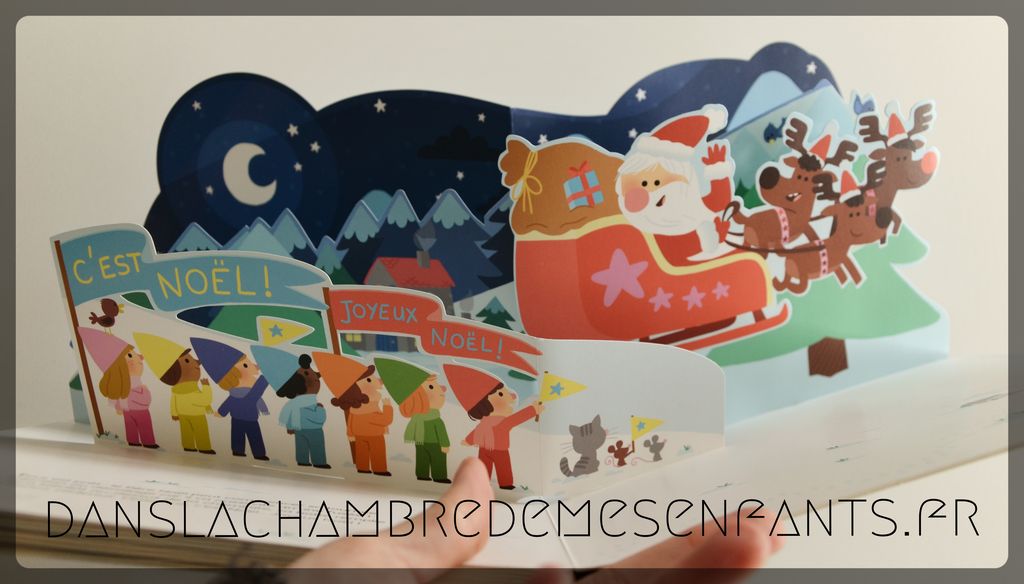 C’est un livre qui aborde agréablement cette jolie thématique, avec tous les bons ingrédients pour que ce soit réussi… jusqu’à réserver une surprise en dernière double page : un grand pop-up pour le départ du Père Noël, « Tout est prêt : le Père Noël peut commencer sa tournée. Attention au décollage car il va aussi vite qu’une fusée ! Il sera bientôt au-dessus de ta cheminée, sa hotte remplie de beaux cadeaux. Cette nuit, c’est Noêl… Joyeux Noël ! ».