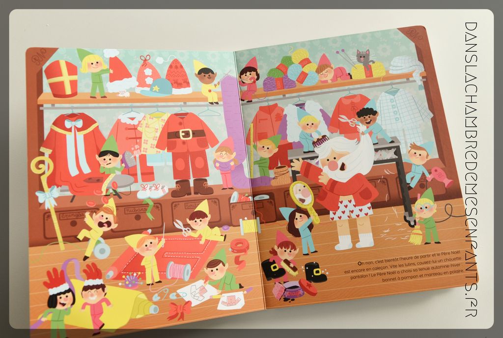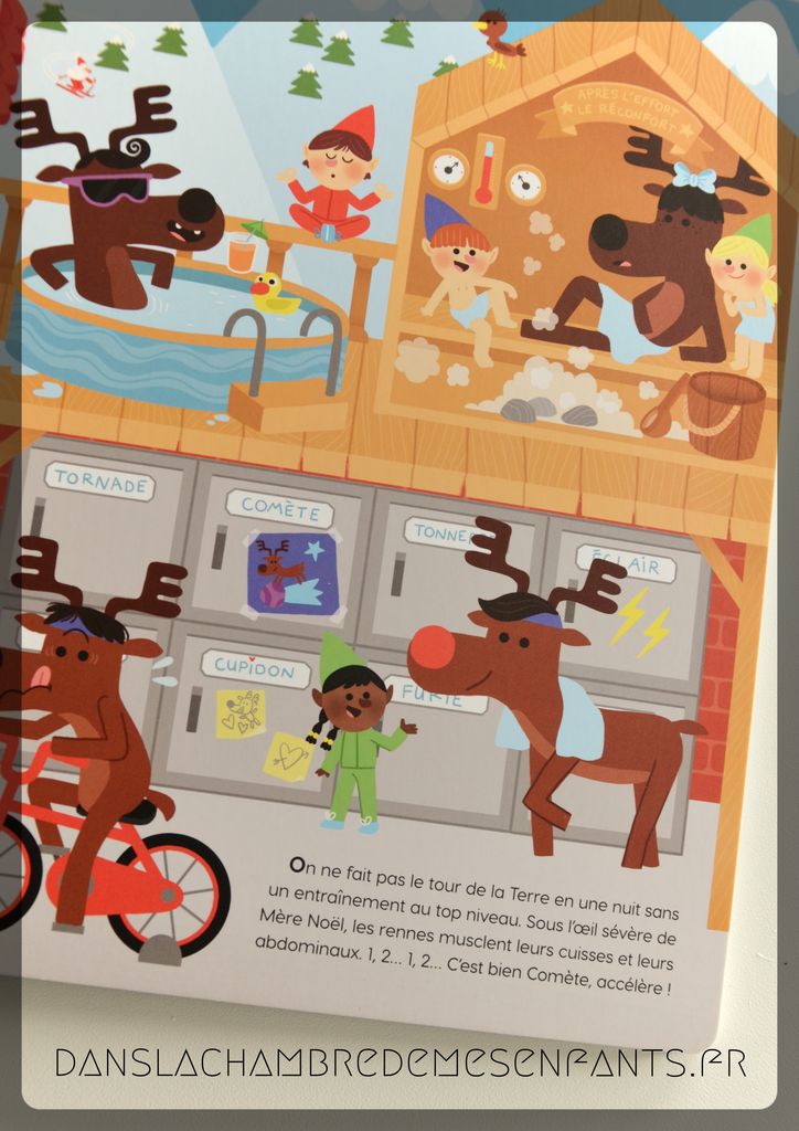 Réception et tri du courrier, confection des jouets… Plus d’immersion et de fun s’il vous plaît ! Entrons également dans la chambre des lutins, leur lieu d’entraînement, sans oublier le passage dans le dressing du Père Noël. Les grandes scènes sont commentées en coin de page mais, ne vous y trompez pas, ce sont elles qui sont à l’honneur et c’est tant mieux ! Elles sont modernes, accueillantes et pleines de vie. Il y a de quoi observer de nombreux détails, ce qui est un vrai plus car des touches humoristiques sont à découvrir (ex : poster « La terre Noël », les rennes revisités durant leur préparation, le chat emballé…).